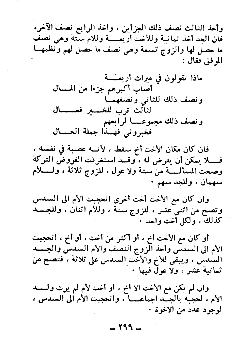 وأخذ الثالث نصف ذلك الجزأين، وأخذ الرابع نصف الآخر، فإن الجحد أخذ ثمانية وللأخت أربعة وللأم ستة وهي نصف ما حصل لها والزوج تسعة وهي نصف ما حصل لهم ونظمها الموفق فقال: