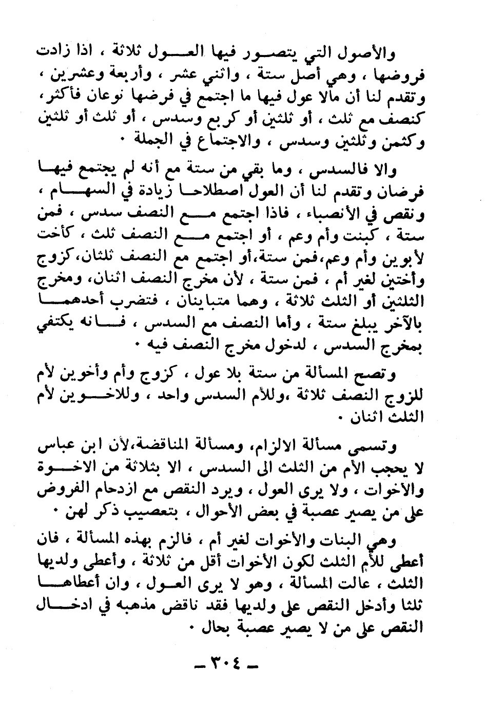 وإلا فالسدس، وما بقي من ستة مع أنه لم يجتمع فيها فرضان وتقدم لنا أن العول اصطلاحًا زيادة في السهام، ونقص في الأنصباء، فإذا اجتمع مع النصف سدس، فمن ستة، كبنت وأم وعم، أو اجتمع مع النصف ثلث، كأخت لأبوين وأم وعم، فمن ستة، أو اجتمع مع النصف ثلثان، كزوج وأختين لغير أم، فمن ستة، لأن مخرج النصف اثنان، ومخرج الثلثين أو الثلث ثلاثة، وهما متباينان، فتضرب أحدهما بالآخر يبلغ ستة، وأما النصف مع السدس، فإنه يكتفي بمخرج السدس، لدخول مخرج النصف فيه.