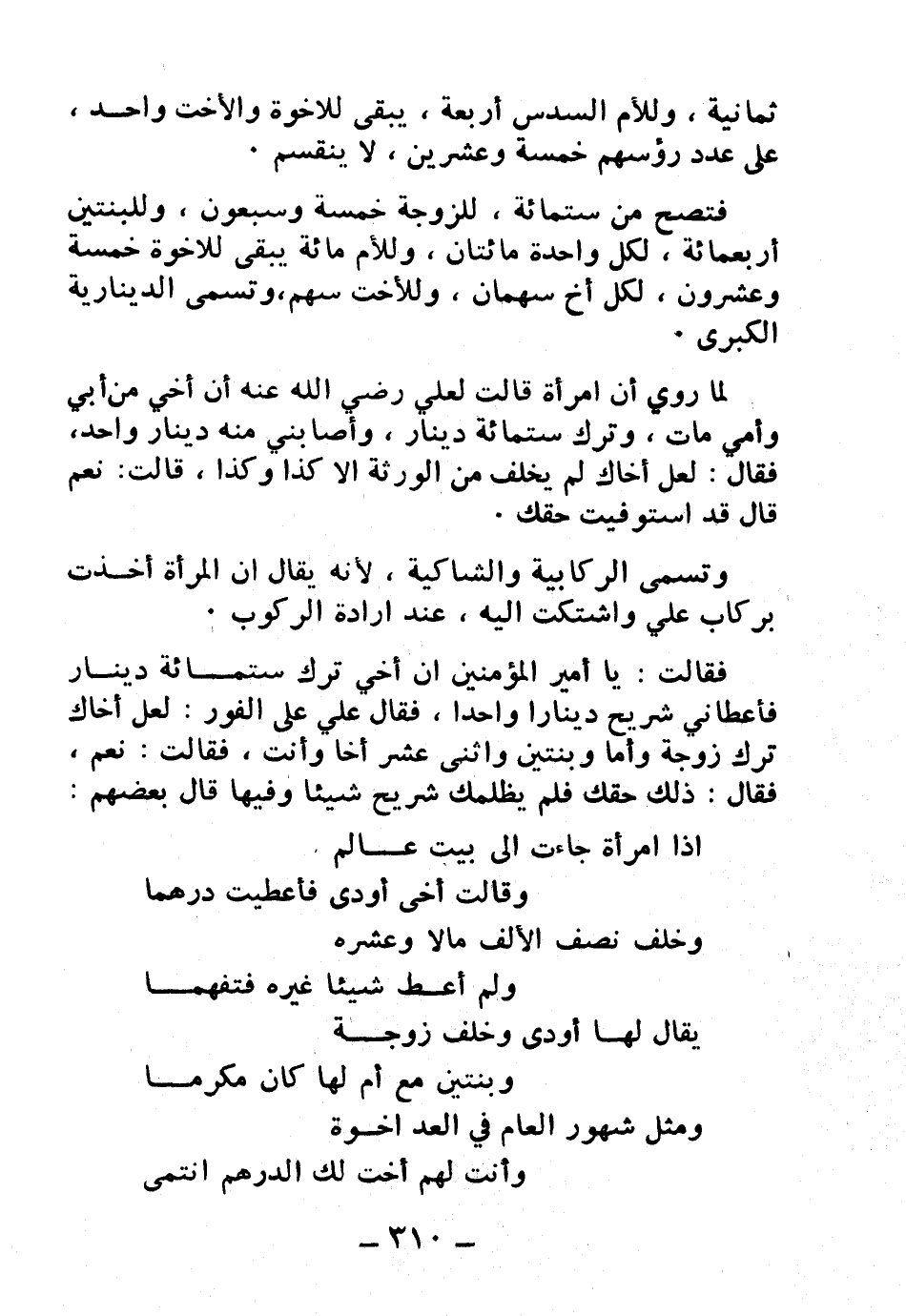 فقالت: يا أمير المؤمنين إن أخي ترك ستمائة دينار فأعطاني شريح دينارًا واحدًا، فقال علي على الفور: لعل أخاك ترك زوجة وأمًا وبنتين واثني عشر أخًا وأنت، فقالت: نعم، فقال: ذلك حقك فلم يظلمك شريح شيئًا وفيها قال بعضهم: