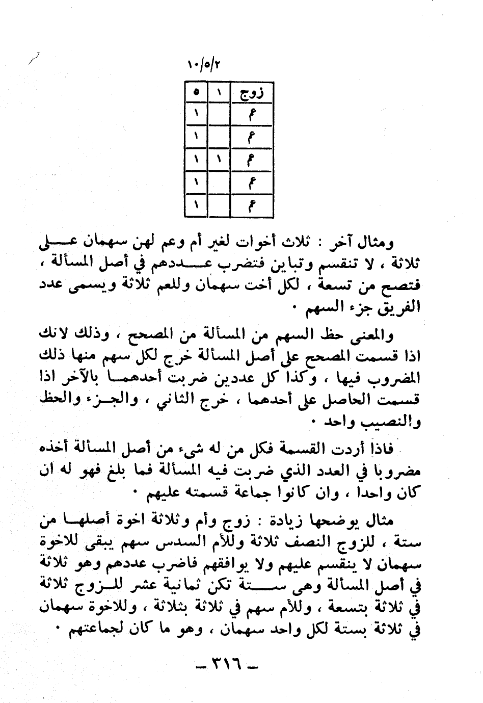 مثال يوضحها زيادة: زوج وأم وثلاثة أخوة أصلها من ستة، للزوج النصف ثلاثة وللأم السدس سهم يبقى للأخوة سهمان لا ينقسم عليهم ولا يوافقهم فارضب عددهم وهو ثلاثة في أصل المسألة وهي ستة تكن ثمانية عشر للزوج ثلاثة في ثلاثة بتسعة، وللأم سهم في ثلاثة بثلاثة، وللأخوة سهمان في ثلاثة بستة لكل واحد سهمان، وهو ما كان لجماعتهم.