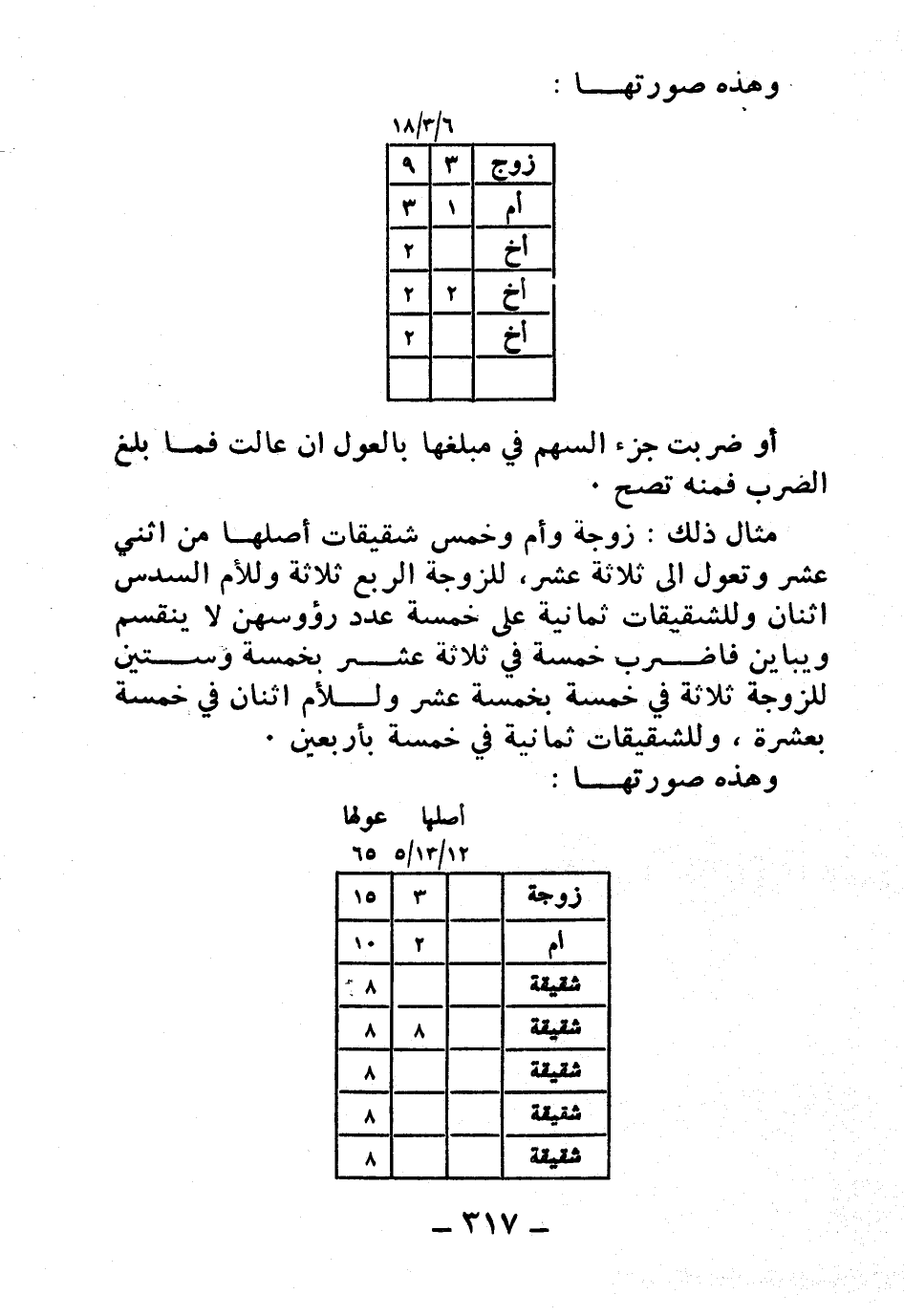 مثال ذلك: زوجة وأم وخمس شقيقات أصلها من اثني عشر وتعول إلى ثلاثة عشر، للزوجة الربع ثلاثة وللأم السدس اثنان وللشقيقات ثمانية على خمسة عدد رؤوسهن لا ينقسم ويباين فاضرب خمسة في ثلاثة عشر بخمسة وستين للزوجة ثلاثة في خمسة بخمسة عشر وللأم اثنان في خمسة بعشرة، وللشقيقات ثمانية في خمسة بأربعين.