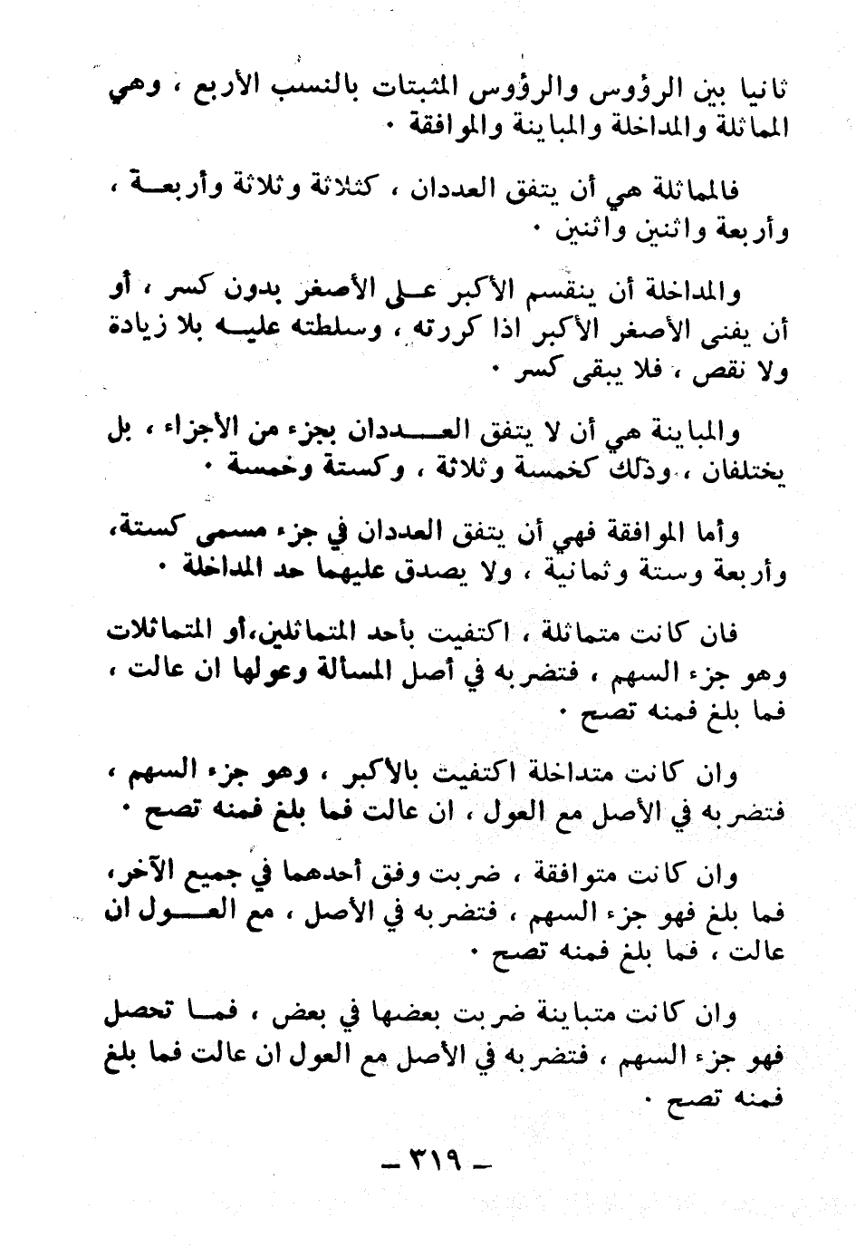 وأما الموافقة فهي أن يتفق العددان في جزء مسمى كستة، وأربعة وستة وثمانية، ولا يصدق عليهما حد المداخلة.