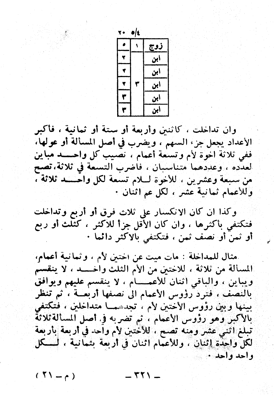 وإن تداخلت، كاثنين وأربعة أو ستة أو ثمانية، فأكبر الأعداد يجعل جزء السهم، ويضرب في أصل المسألة أو عولها، ففي ثلاثة أخوة لأم وتسعة أعمام، نصيب كل واحد مباين لعدده، وعددهما متناسبان، فاضرب التسعة في ثلاثة، تصح من سبعة وعشرين، للأخوة للأم تسعة لكل واحد ثلاثة، وللأعمام ثمانية عشر، لكل عم اثنان.