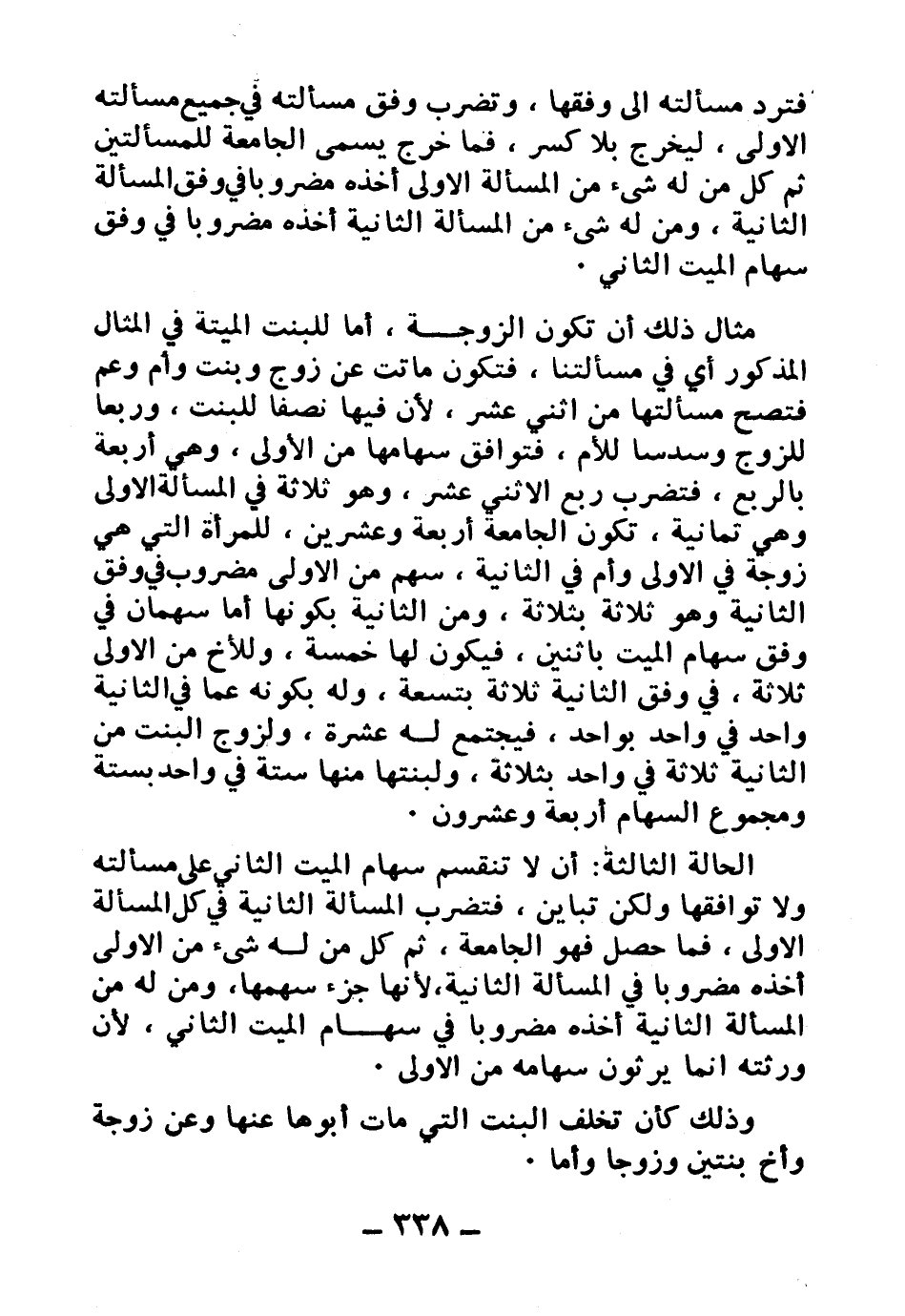 مثال ذلك أن تكون الزوجة، أما للبنت الميتة في المثال المذكور أي في مسألتنا، فتكون ماتت عن زوج وبنت وأم وعم فتصح مسألتها من اثني عشر، لأن فيها نصفًا للبنت، وربعًا للزوج وسدسًا للأم، فتوافق سهامها من الأولى، وهي أربعة بالربع، فتضرب ربع الاثني عشر، وهو ثلاثة في المسألة الأولى وهي ثمانية، تكون الجامعة أربعة وعشرين، للمرأة التي هي زوجة في الأولى وأم في الثانية، فيكون لها خمسة، وللأخ من الأولى ثلاثة، ولبنتها منها ستة في واحد بستة ومجموع السهام أربعة وعشرون.