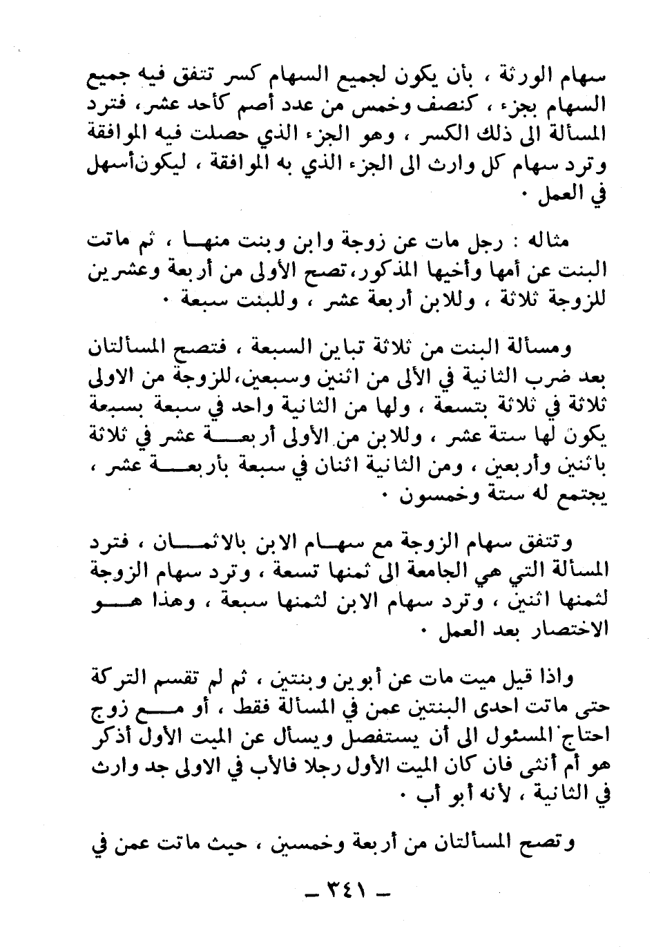 وتتفق سهام الزوجة مع سهام الابن بالأثمان، فترد المسألة التي هي الجامعة إلى ثمنها تسعة، وترد سهام الزوجة لثمنها اثنين، وترد سهام الابن لثمنها سبعة، وهذا هو الاختصار بعد العمل.