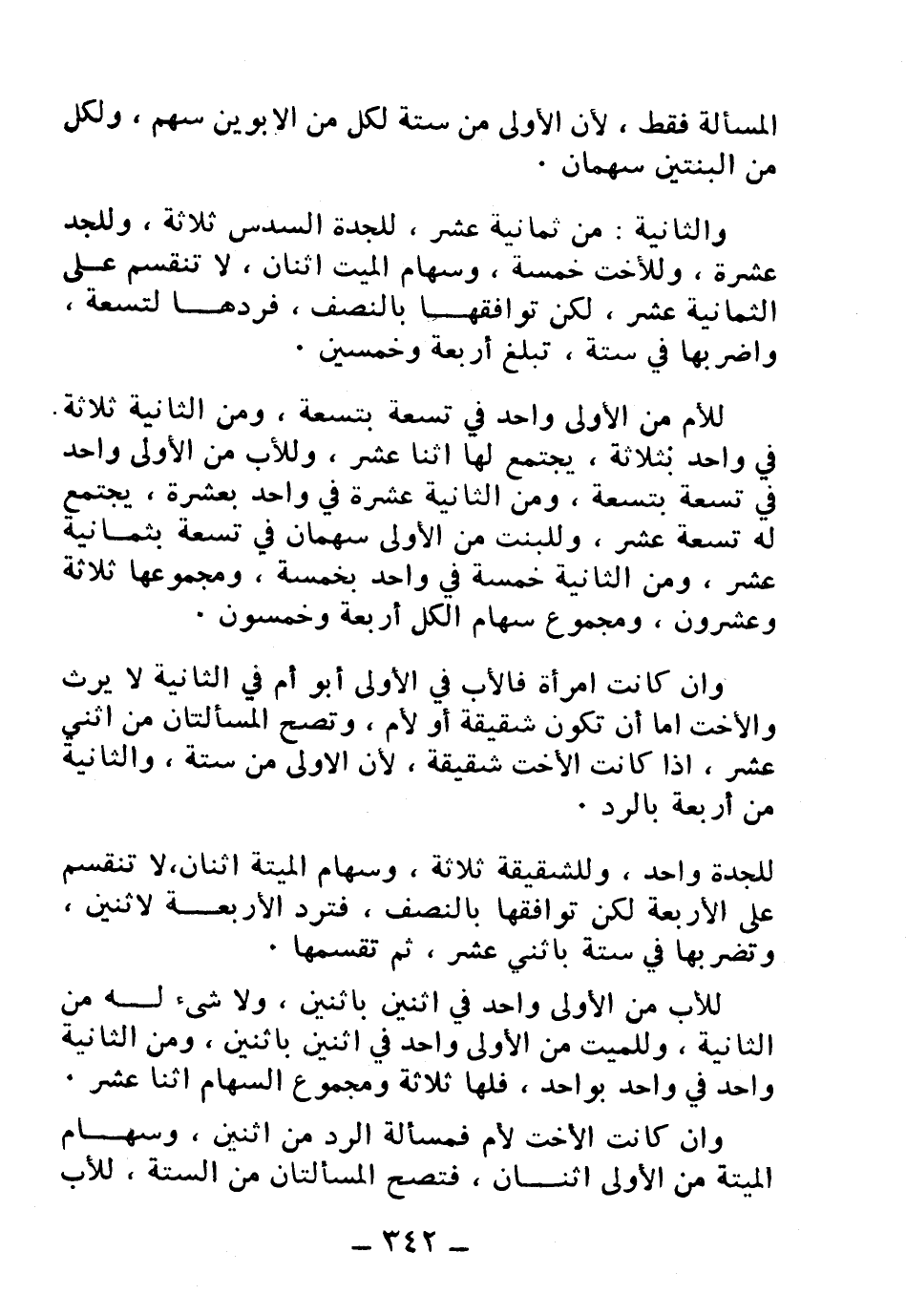 للأم من الأولى واحد في تسعة بتسعة، ومن الثانية ثلاثة. في واحد بثالثة، يجتمع لها اثنا عشر، وللأب من الأولى واحد في تسعة بتسعة، ومن الثانية عشرة في واحد بعشرة، يجتمع له تسعة عشر، وللبنت من الأولى سهمان في تسعة بثمانية عشر، ومن الثانية خمسة في واحد بخمسة، ومجموعها ثلاثة وعشرون، ومجموع سهام الكل أربعة وخمسون.