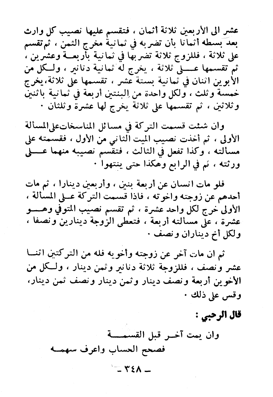 ثم إن مات آخر عن زوجته وأخويه فله من التركتين اثنا عشر ونصف، فللزوجة ثلاثة دنانير وثمن دينار، وكل من الأخوين أربعة ونصف دينار وثمن دينار ونصف ثمن دينار، وقس على ذلك.
