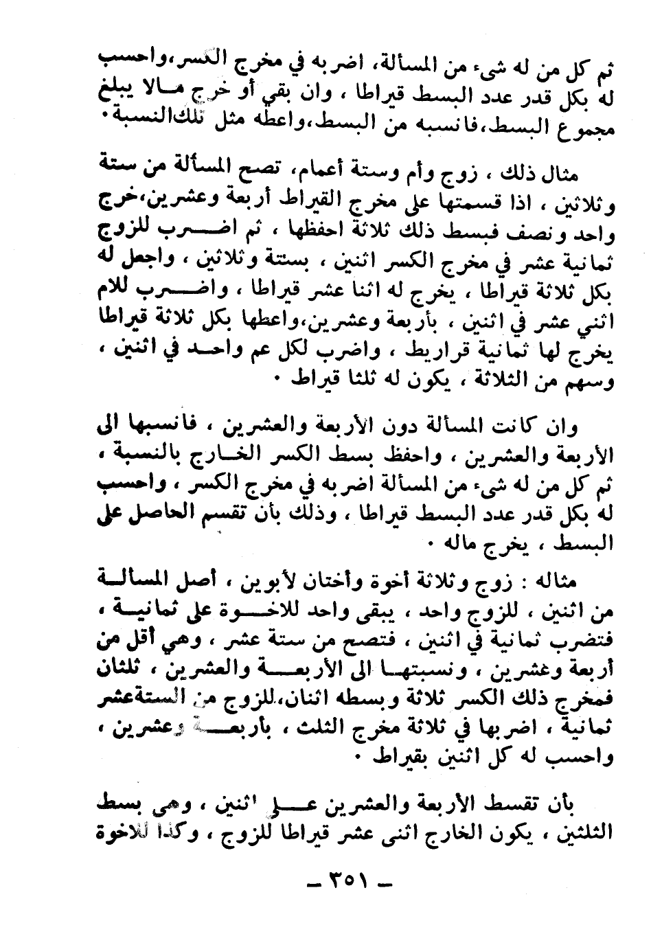 مثال ذلك، زوج وأم وستة أعمام، تصح المسألة من ستة وثلاثين، إذا قسمتها على مخرج القيراط أربعة وعشرين، خرج واحد ونصف فبسط ذلك ثلاثة احفظها، ثم اضرب للزوج ثمانية عشر في مخرج الكسر اثنين، بستة وثلاثين، واجعل له بكل ثلاثة قيراطًا، يخرج له اثنا عشر قيراطًا، واضرب للأم اثني عشر في اثنين، بأربعة وعشرين، واعطها بكل ثلاثًا قيراطًا يخرج لها ثمانية قراريط، واضرب لكل عم واحد في اثنين، وسهم من الثلاثة، يكون له ثلثا قيراط.