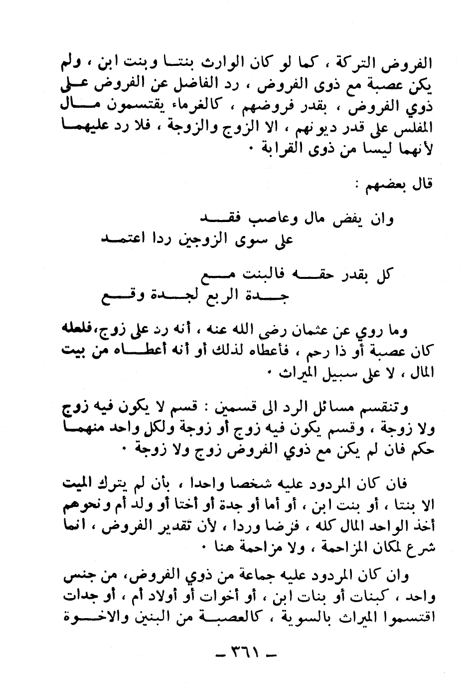 وتنقسم مسائل الرد إلى قسمين: قسم لا يكون فيه زوج ولا زوجة، وقسم يكون فيه زوج أو زوجة ولكل واحد منهما حكم فإن لم يكن مع ذوي الفروض زوج ولا زوجة.
