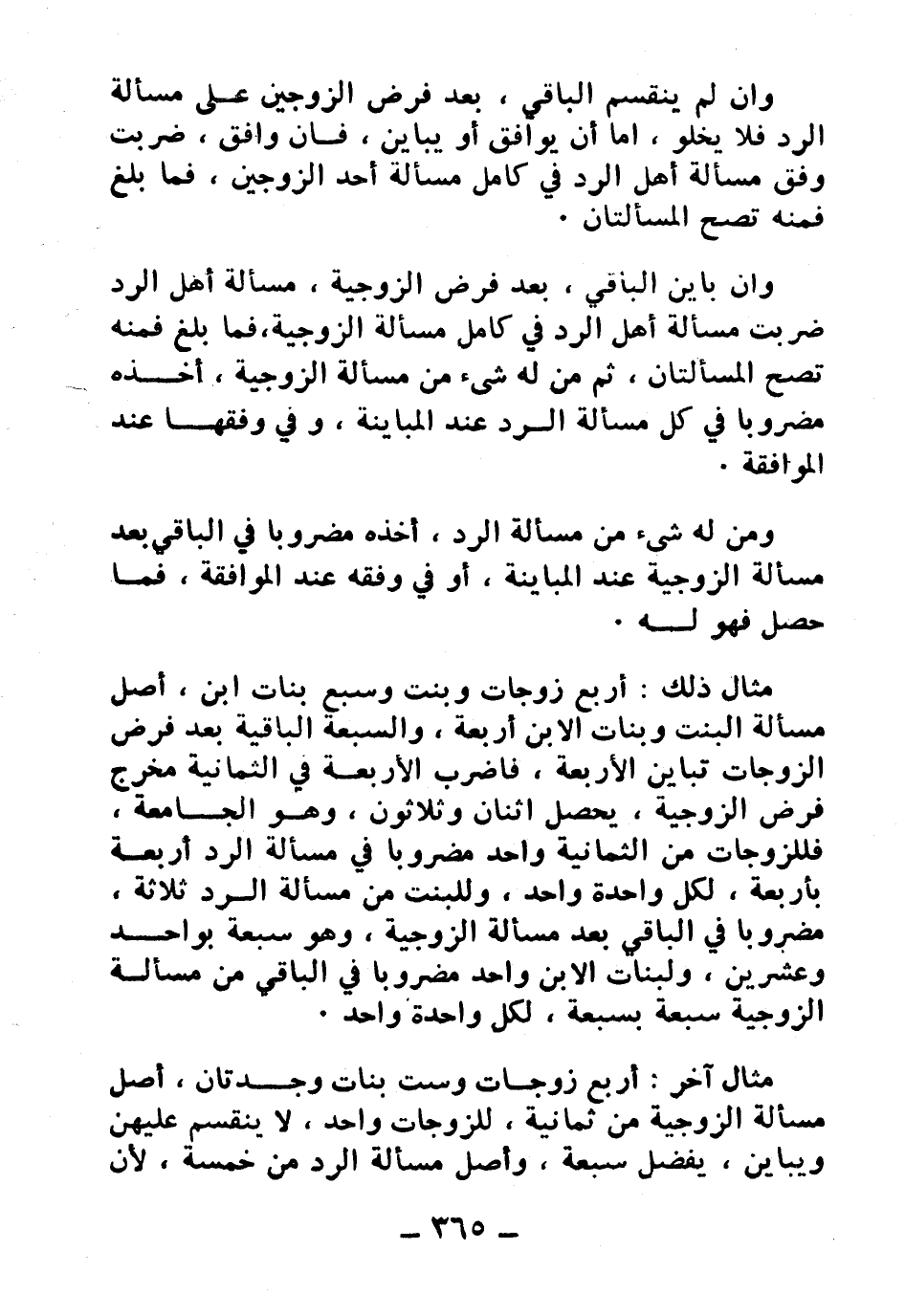 مثال آخر: أربع زوجات وست بنات وجدتان، أصل مسألة الزوجية من ثمانية، للزوجات واحد، لا ينقسم عليهن ويباين، يفضل سبعة، وأصل مسألة الرد من خمسة، لأن مسألة الرد لا تزيد على الخمسة أبدًا، كما لا يمكن أن تكون من سبعة أبدًا.