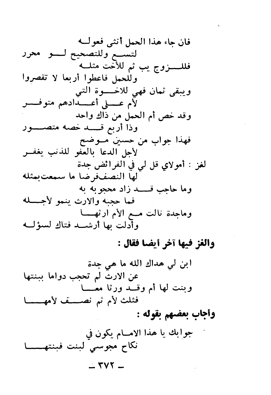 أَمولاَيَ قُلْ لِيْ في الفرائض جّدةٌ ... لها النِصْفُ فرْضًا ما سَمِعْتُ بِمِثْلِهِ