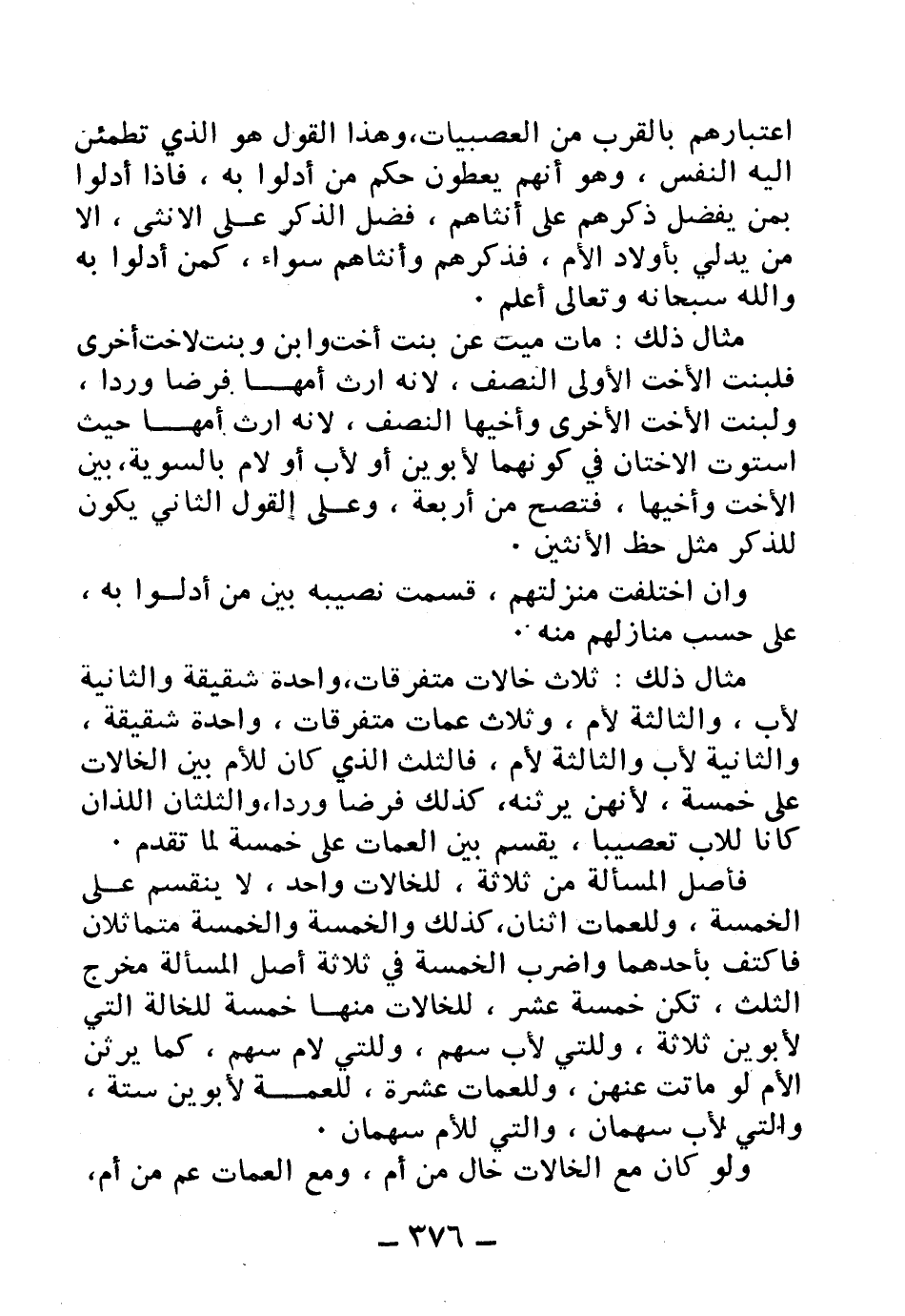 مثال ذلك: ثلاث خالات متفرقات، واحدة شقيقة والثانية لأب، والثالثة لأم، وثلاث عمات متفرقات، واحدة شقيقة، والثانية لأب والثالثة لأم، فالثلث الذي كان للأم بين الخالات على خمسة، لأنهن يرثنه، كذلك فرضًا وردًا، والثلثان اللذان كانا للأب تعصيبًا، يقسم بين العمات على خمسة لما تقدم.