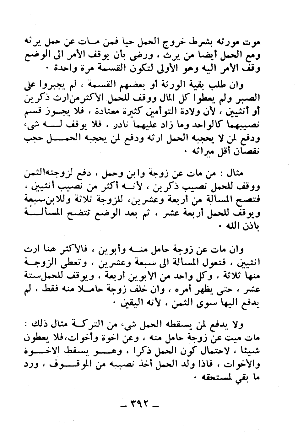 ولا يدفع لمن يسقطه الحمل شيء من التركة مثال ذلك: مات ميت عن زوجة حامل منه، وعن أخوة وأخوات، فلا يعطون شيئًا، لاحتمال كون الحمل ذكرًا، وهو يسقط الأخوة والأخوات، فإذا ولد الحمل أخذ نصيبه من الموقوف، ورد ما بقي لمستحقه.