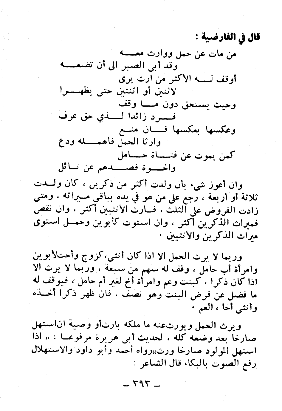 وربما لا يرث الحمل إلا إذا كان أنثى، كزوج وأخت لأبوين وامرأة أب حامل، وقف له سهم من سبعة، وربما لا يرث إلا إذا كان ذكرا، كبنت وعم وامرأة أخ لغير أم حامل، فيوقف له ما فضل عن فرض البنت وهو نصف، فإن ظهر ذكرًا أخذه وأنثى أخا، العم.