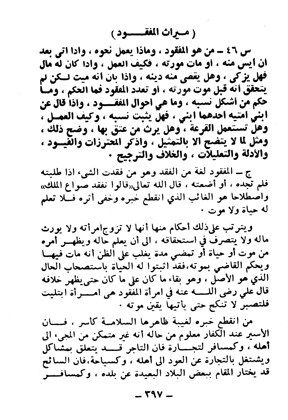 س49: من هو المفقود، وماذا يعمل نحوه، وإذا أتى بعد أن أيس منه، أو مات مورثه، فكيف العمل، وإذا كان له مال فهل يزكى، وهل يقضى منه دينه، وإذا بان أنه ميت لكن لم يتحقق أنه قبل موت مورثه، أو تعدد المفقود فما الحكم، وما حكم من أشكل نسبه، وما هي أحوال المفقود فما الحكم، وما حكم من أشكل نسبه، وما هي أحوال المفقود، وإذا قال عن ابني أمتيه أحدهما ابني، فهل يثبت نسبه، وكيف العمل، وهل تستعمل القرعة، وهل يرث من عتق بها، وضح ذلك ومثل لما لا يتضح إلا بالتمثيل، واذكر المحترزات والقيود، والأدلة والتعليلات، والخلاف والترجيح.