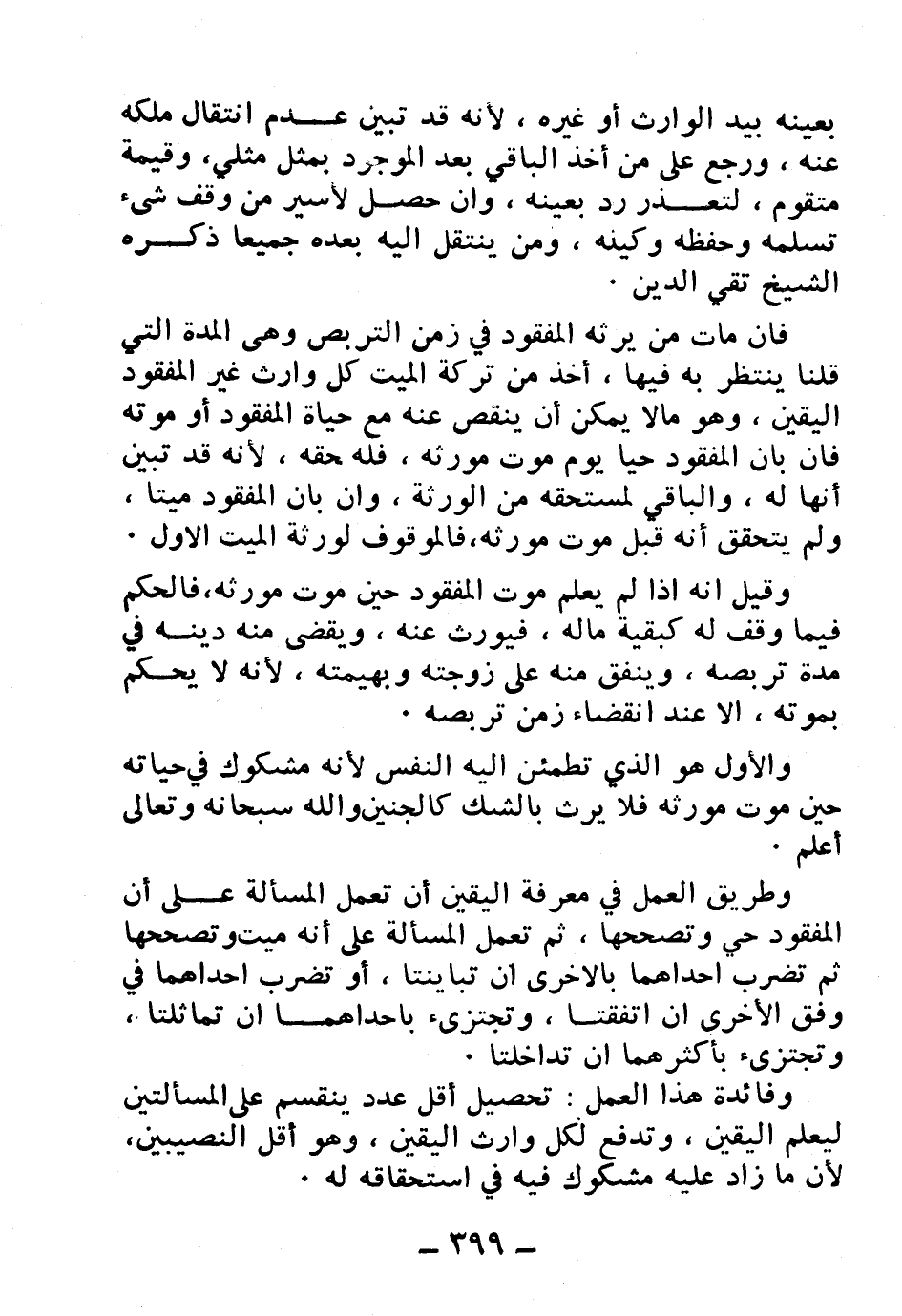 وقيل إنه إذا لم يعلم موت المفقود حين موت مورثه، فالحكم فيما وقف له كبقية ماله، فيورث عنه، ويقضي منه دينه في مدة تربصه، وينفق منه على زوجته وبهيمته، لأنه لا يحكم بموته، إلا عند انقضاء زمن تربصه.