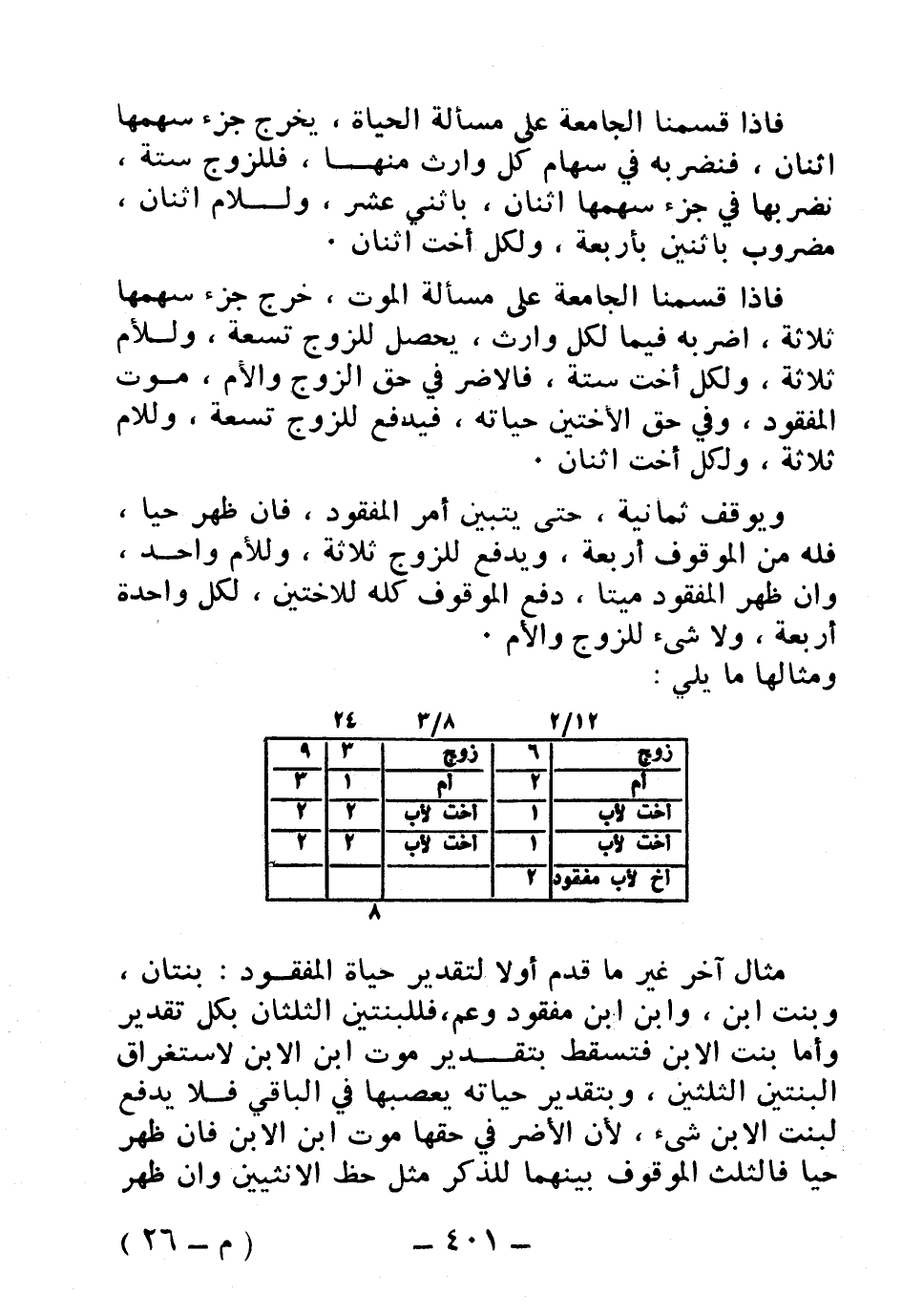 مثال آخر غير ما قدم أولاً لتقدير حياة المفقود: بنتان، وبنت ابن، وابن ابن مفقود وعم، فللبنتين الثلثان بكل تقدير وأما بنت الابن فتسقط بتقدير موت ابن الابن لاستغراق البنتين