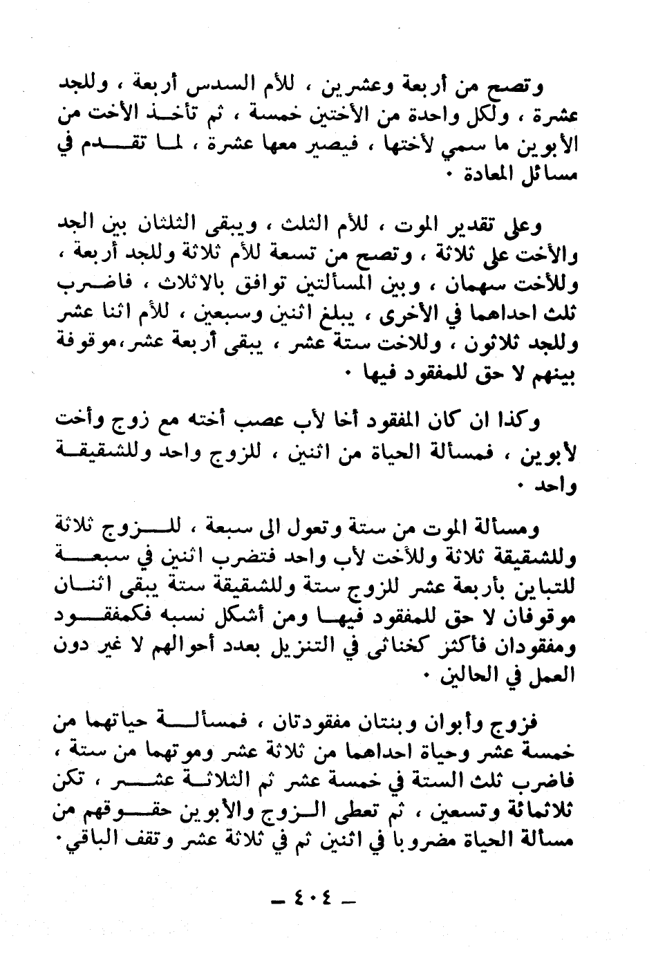 وكذا إن كان المفقود أخًا لأب عصب أخته مع زوج وأخت لأبوين، فمسألة الحياة من اثنين، للزوج واحد وللشقيقة واحد.
