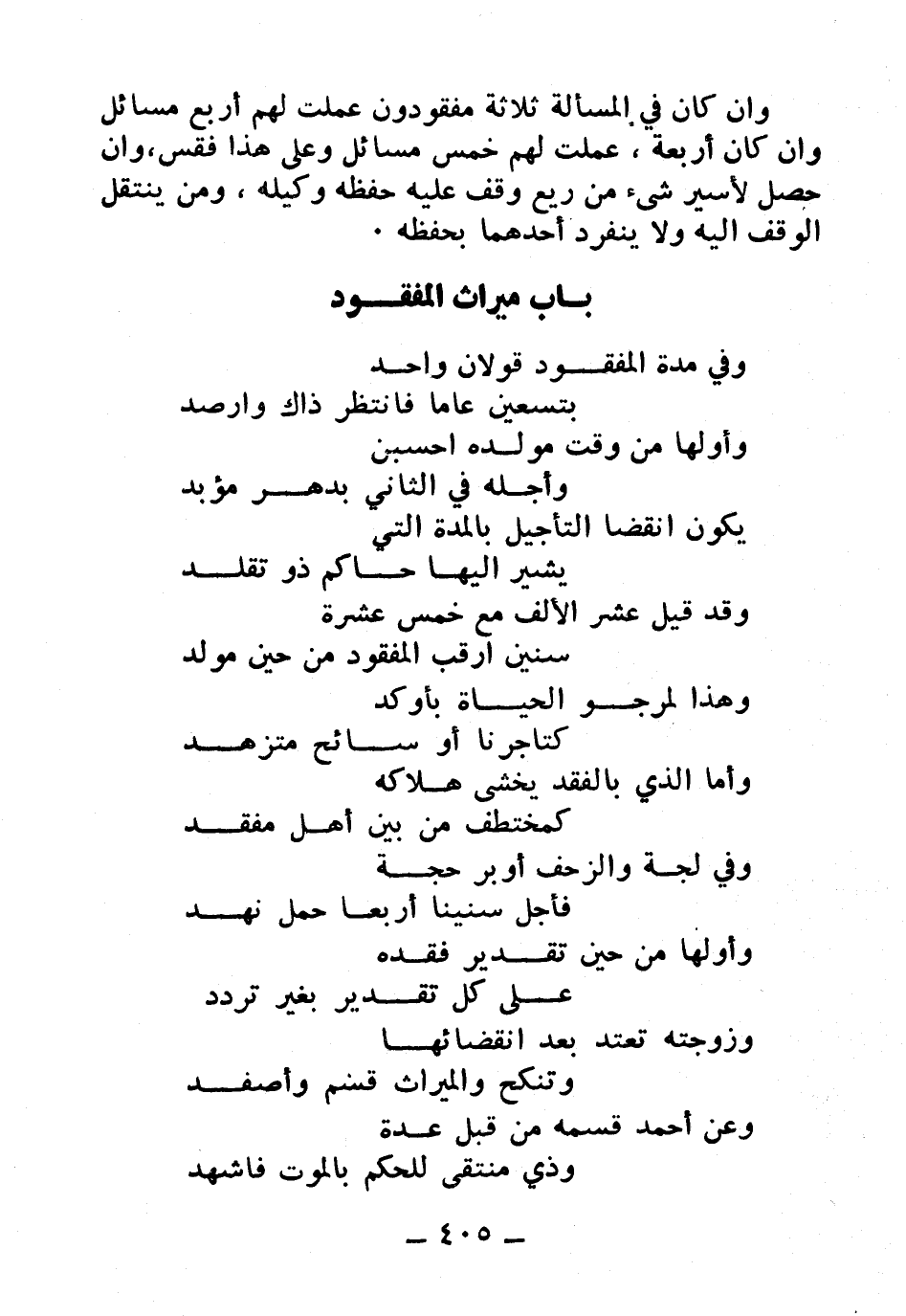 وفي مدة المفقود قولان واحد ... بتسعين عامًا فانتظر ذاك وارصد
