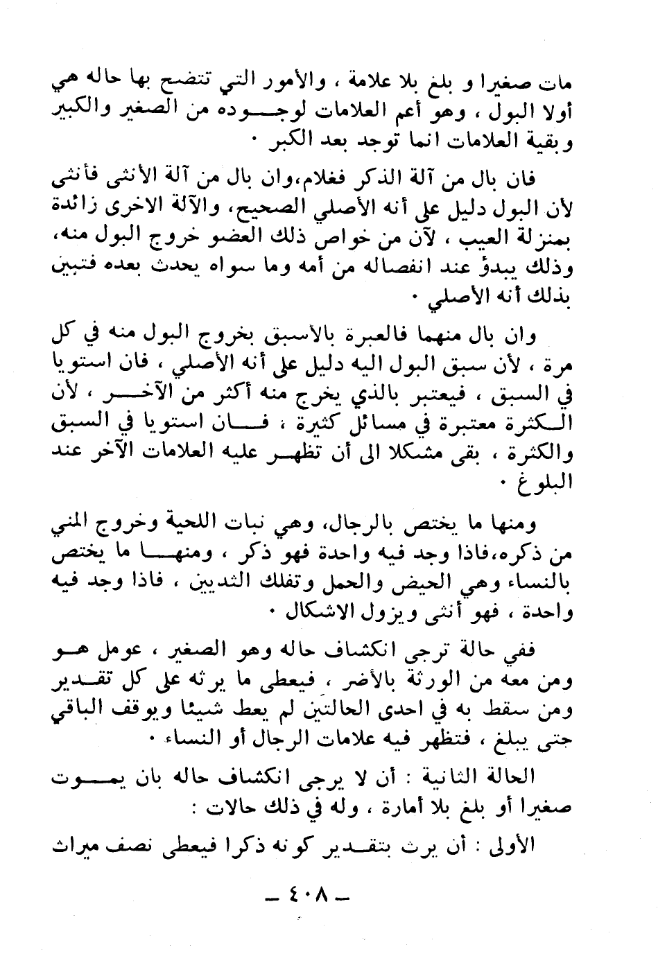 ومنها ما يختص بالرجال، وهي نبات اللحية وخروج المني من ذكره، فإذا وجد فيه واحدة فه ذكر، ومنها ما يختص بالنساء وهي الحيض والحمل وتفلك الثديين، فإذا وجد فيه واحدة، فهو أنثى ويزول الإشكال.