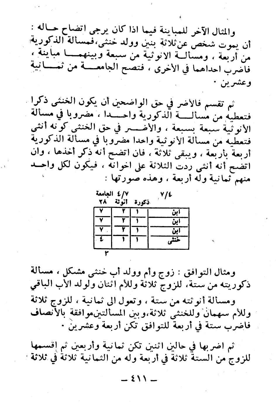ومسألة أنوثته من ستة، وتعول إلى ثمانية، للزوج ثلاثة وللأم سهمان وللخنثى ثلاثة، وبين المسألتين موافقة بالأنصاف فاضرب ستة في أربعة للتوافق تكن أربعة وعشرين.