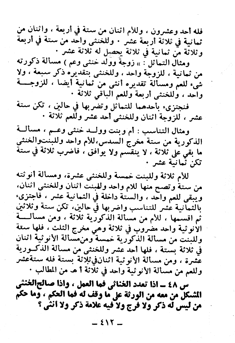 س51: إذا تعدد الخناثي فما العمل، وإذا صالح الخنثى المشكل من معه من الورثة على ما وقف له فما الحكم، وما حكم من ليس له ذكر ولا فرج ولا فيه علامة ذكر ولا أنثى؟