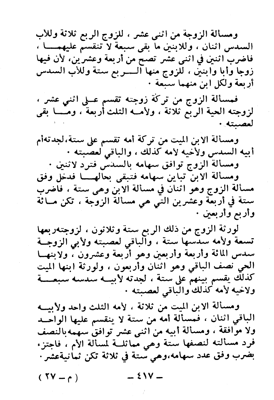 ومسألة الزوجة من اثني عشر، للزوج الربع ثلاثة وللأب السدس اثنان، وللابنين ما بقي سبعة لا تنقسم عليهما، فاضرب اثنين في اثني عشر تصح من أربعة وعشرين، لأن فيها زوجًا وأبًا وابنين، للزوج منها الربع ستة وللأب السدس أربعة ولكل ابن منهما سبعة.