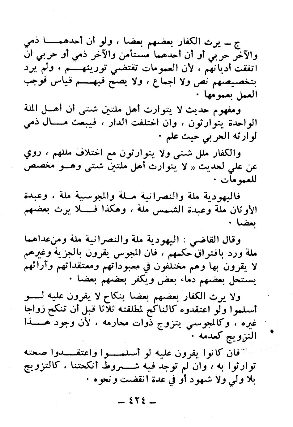 ج: يرث الكفار بعضهم بعضًا، ولو أن أحدهما ذمي والآخر حربي أو أن أحدهما مستأمن والآخر ذمي أو حربي إن اتفقت أديانهم، لأن العمومات تقتضي توريثهم، ولم يرد بتخصيصهم نص ولا إجماع، ولا يصح فيهم قياس فوجب العمل بعمومها.
