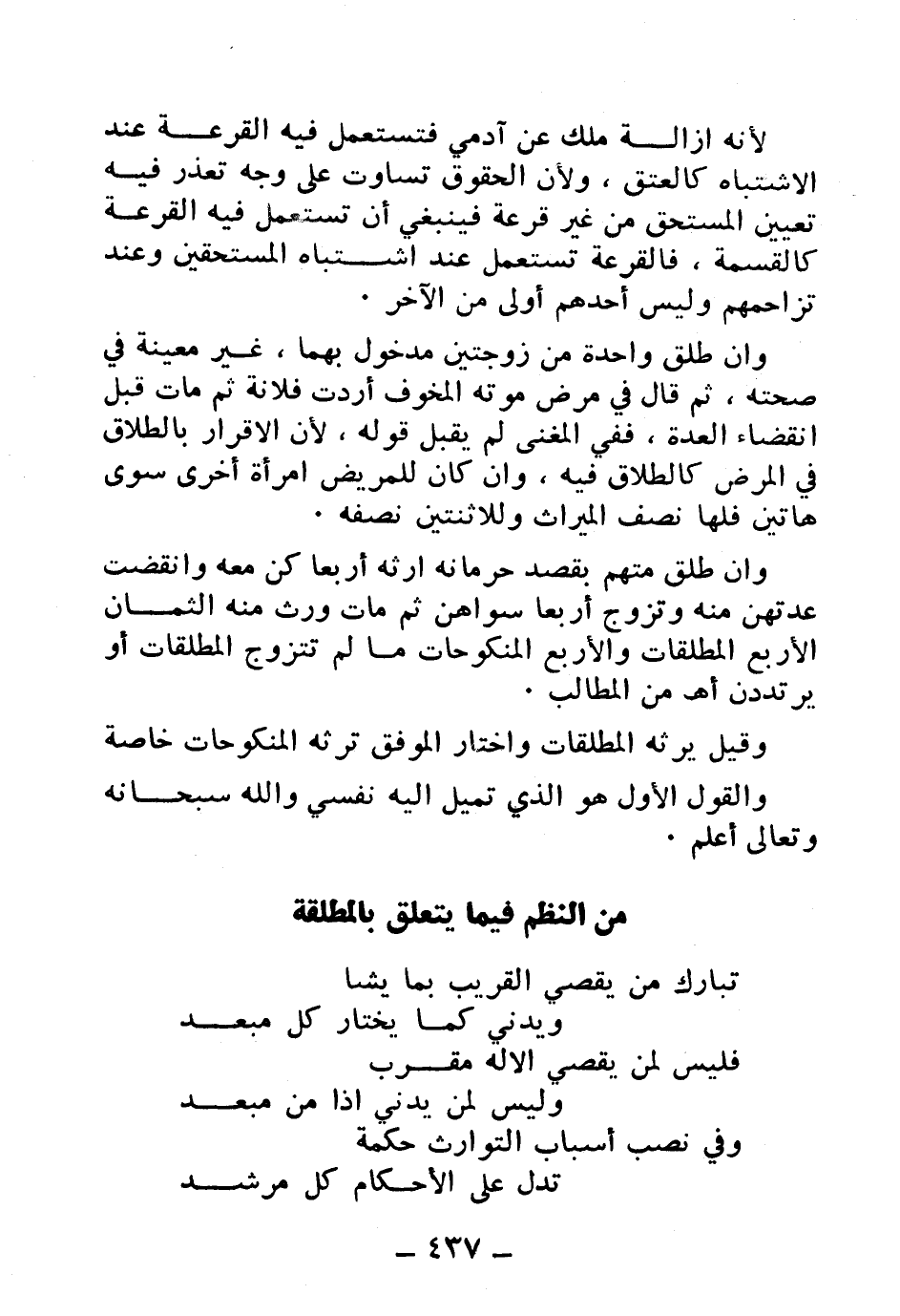 وقيل يرثه المطلقات واختار الموفق ترثه المنكوحات خاصة والقول الأول هو الذي تميل إليه نفسي والله - سبحانه وتعالى - أعلم.