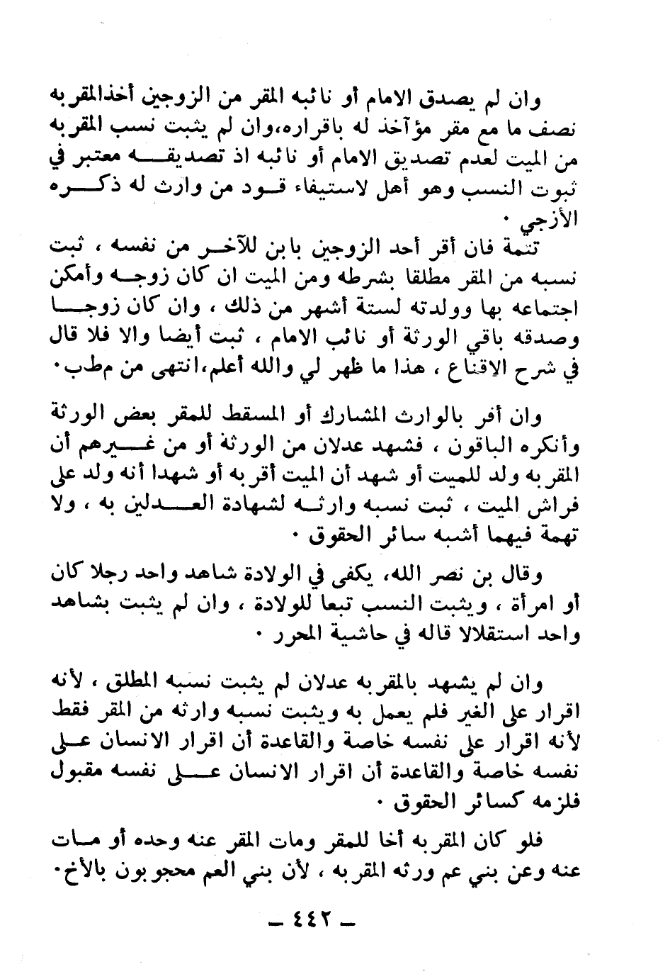 وإن لم يشهد بالمقر به عدلان لم يثبت نسبه المطلق، لأنه إقرار على الغير فلم يعمل به ويثبت نسبه وارثه من المقر فقط لأنه إقرار على نفسه خاصة والقاعدة أن إقرار الإنسان على نفسه خاصة والقاعدة أن إقرار الإنسان على نفسه مقبول فلزمه كسائر الحقوق.