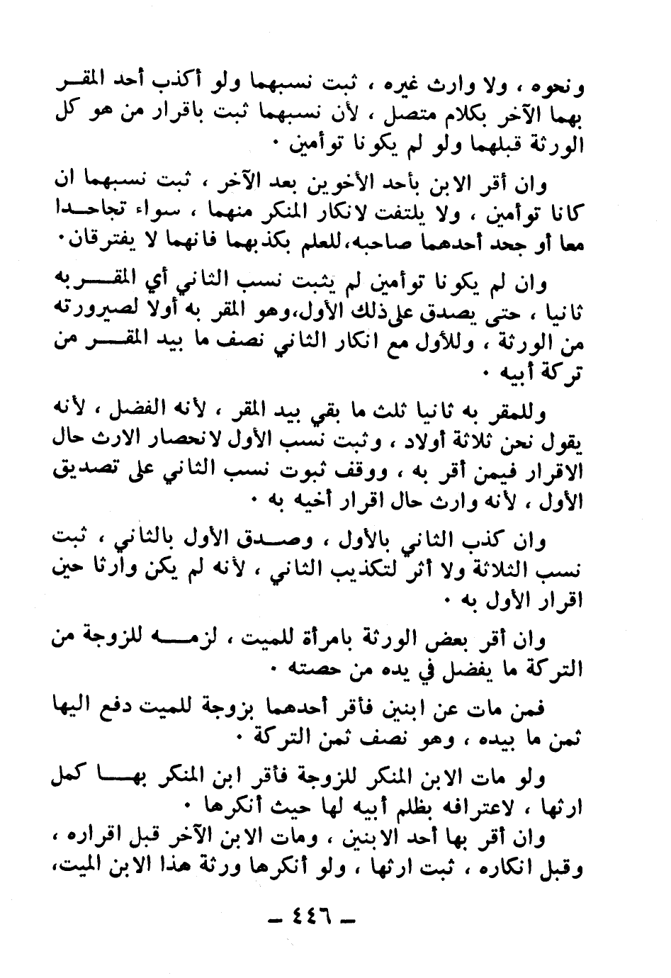 وإن لم يكونا توأمين لم يثبت نسب الثاني أي المقر به ثانيًا، حتى يصدق على ذلك الأول، وهو المقر به أولا لصيرورته من الورثة، وللأول مع إنكار الثاني نصف ما بيد المقر من تركة أبيه.