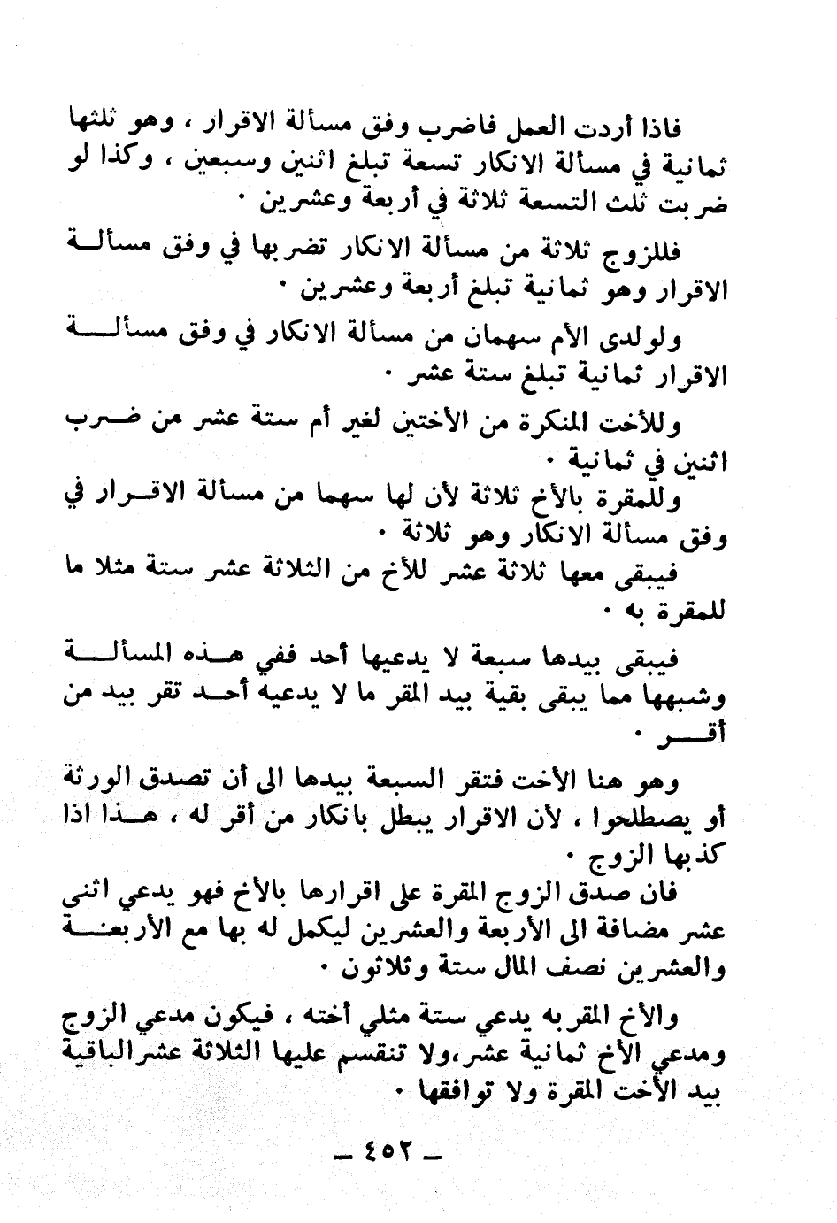 فاذا أردت العمل فاضرب وفق مسالة الإقرار , وهو ثلثها ثمانية في مسألة الإنكار تسعة تبلغ اثنين وسبعين , وكذا لو ضربت ثلث التسعة ثلاثة في أربعة وعشرين.