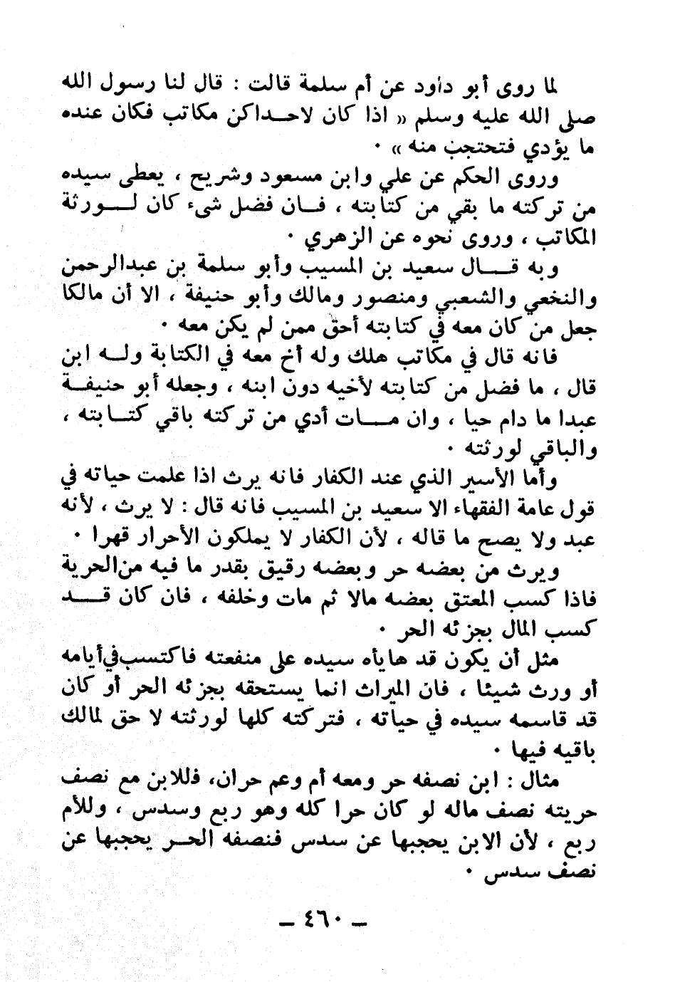 مثال: ابن نصفه حر ومعه أم وعم حران، فللابن مع نصف حريته نصف ماله لو كان حرًا كله وهو ربع وسدس، وللأم ربع، لأن الابن يحجبها عن سدس فنصفه الحر يحجبها عن نصف سدس.