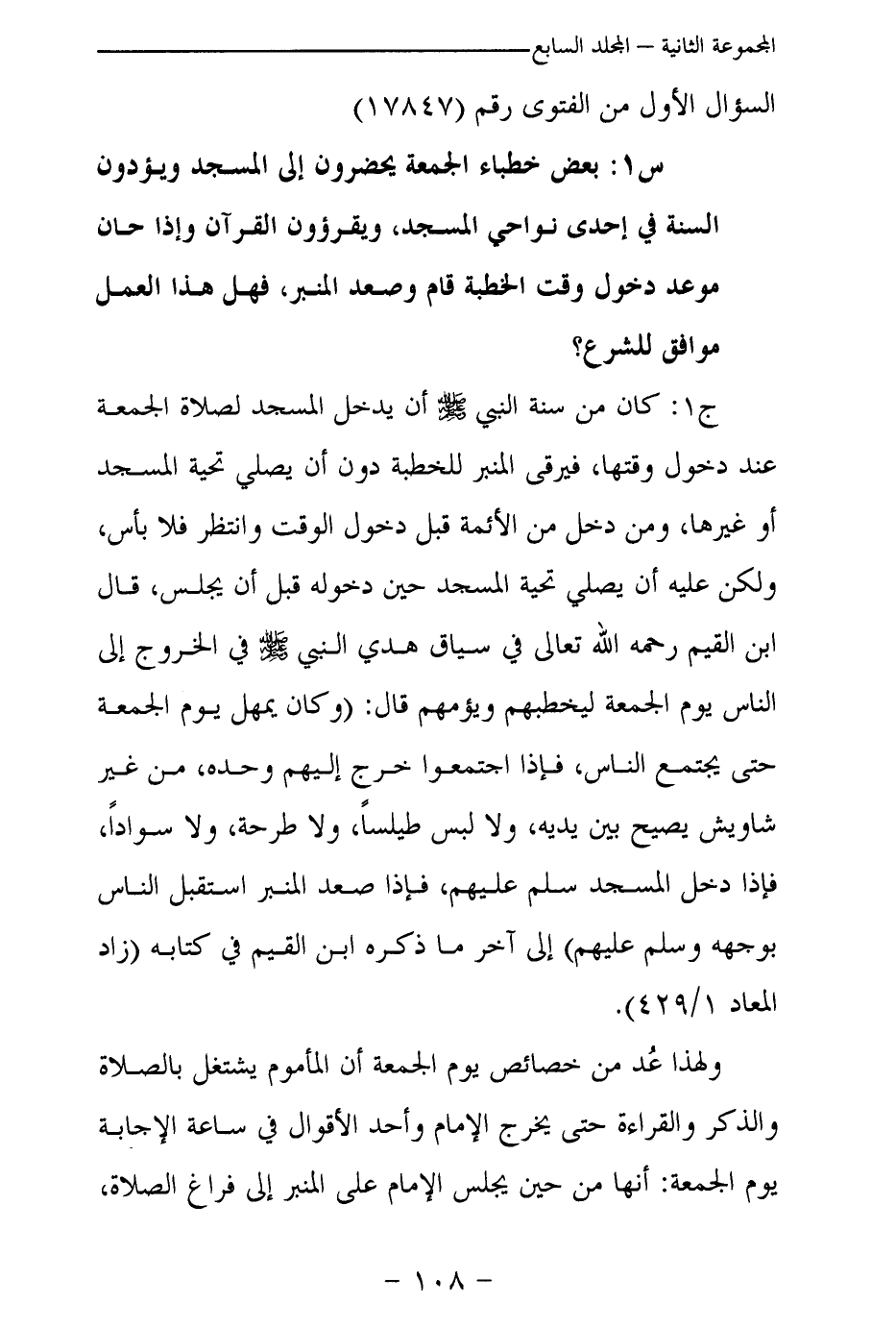 س 1: بعض خطباء الجمعة يحضرون إلى المسجد ويؤدون السنة في إحدى نواحي المسجد، ويقرؤون القرآن وإذا حان موعد دخول وقت الخطبة قام وصعد المنبر، فهل هذا العمل موافق للشرع؟