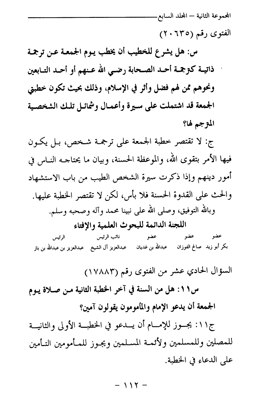 س 11: هل من السنة في آخر الخطبة الثانية من صلاة يوم الجمعة أن يدعو الإمام والمأمومون يقولون آمين؟