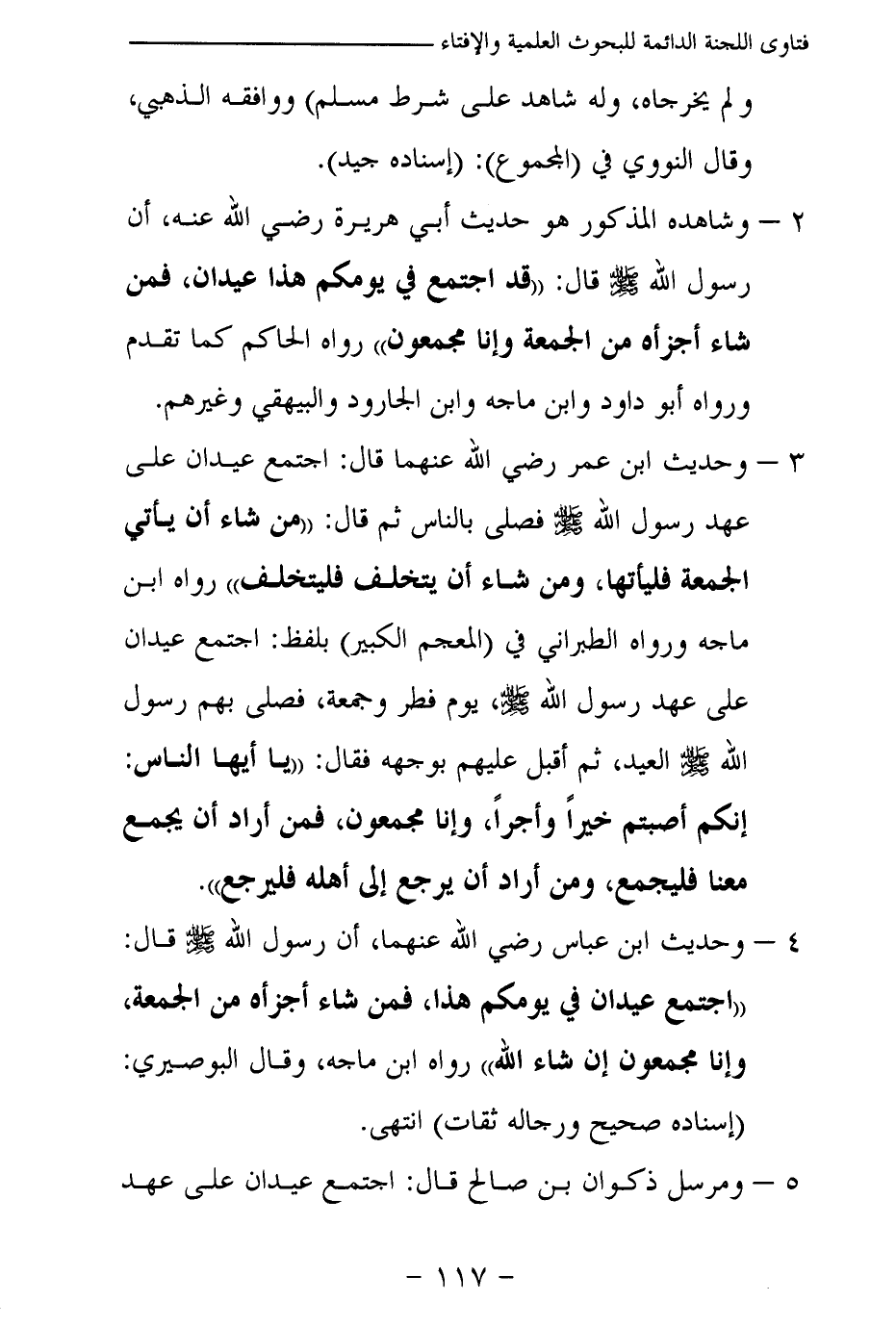 4- وحديث ابن عباس رضي الله عنهما، أن رسول الله - صلى الله عليه وسلم – قال: «اجتمع عيدان في يومكم هذا، فمن شاء أجزأه من الجمعة، وإنا مجمعون إن شاء الله (¬4) » رواه ابن ماجه، وقال البوصيري (إسناده صحيح ورجاله ثقات) انتهى.