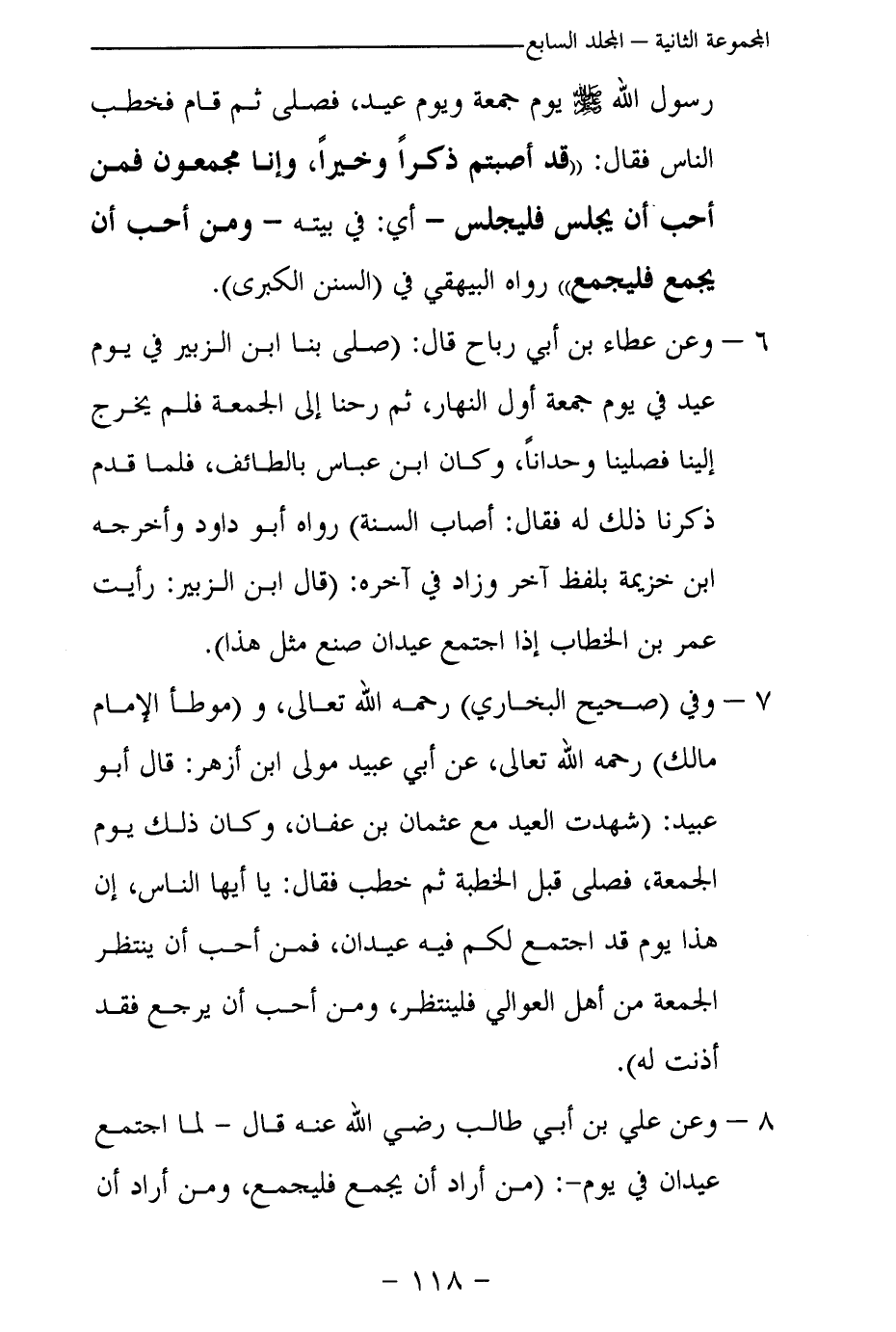 8- وعن علي بن أبي طالب رضي الله عنه قال – لما اجتمع عيدان في يوم -: (من أراد أن يجمع فليجمع، ومن أراد أن