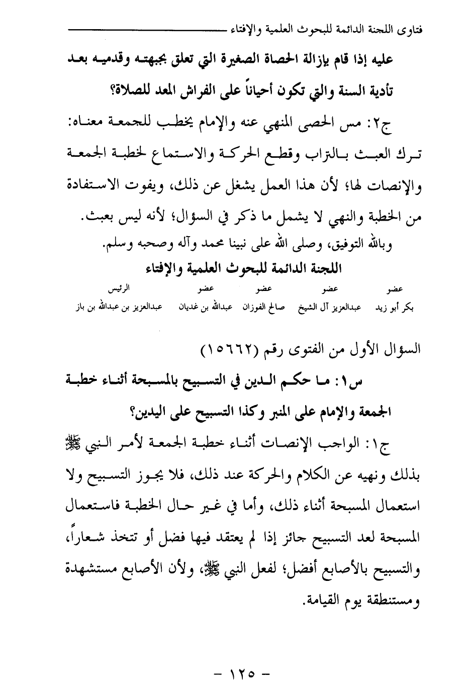 س 1: ما حكم الدين في التسبيح بالمسبحة أثناء خطبة الجمعة والإمام على المنبر وكذا التسبيح على اليدين؟