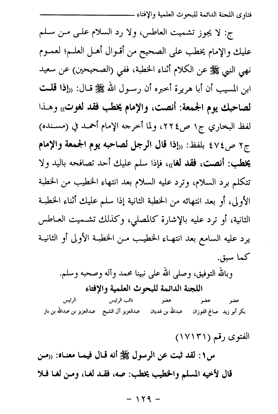 ج: لا يجوز تشميت العاطس، ولا رد السلام على من سلم عليك والإمام يخطب على الصحيح من أقوال أهل العلم؛ لعموم نهي النبي - صلى الله عليه وسلم - عن الكلام أثناء الخطبة، ففي (الصحيحين) عن سعيد بن المسيب أن أبا هريرة أخبره أن رسول الله - صلى الله عليه وسلم - قال: «إذا قلت لصاحبك يوم الجمعة: أنصت، والإمام يخطب فقد لغوت (¬1) » وهذا لفظ البخاري ج 1 ص 224، ولما أخرجه الإمام أحمد في (مسنده) ج 2 ص 474 بلفظ: «إذا قال الرجل لصاحبه يوم الجمعة والإمام يخطب: أنصت، فقد لغا (¬2) » فإذا سلم عليك أحد تصافحه باليد ولا تتكلم برد السلام، وترد عليه السلام بعد انتهاء الخطيب من الخطبة الأولى، أو بعد انتهائه من الخطبة الثانية إذا سلم عليك أثناء الخطبة الثانية، أو ترد عليه بالإشارة كالمصلي، وكذلك تشميت العاطس يرد عليه السامع بعد انتهاء الخطيب من الخطبة الأولى أو الثانية كما سبق.