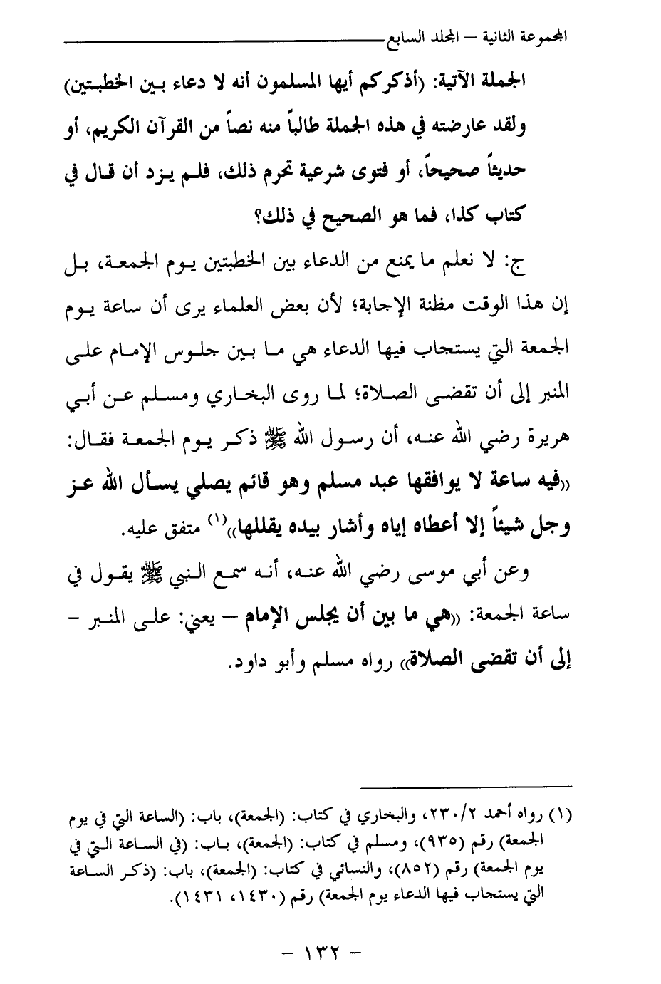(¬1) رواه أحمد 2 / 230، والبخاري في كتاب: (الجمعة) ، باب: (الساعة التي في يوم الجمعة) رقم (935) ، ومسلم في كتاب: (الجمعة) ، باب: (في الساعة التي في يوم الجمعة) رقم (852) ، والنسائي في كتاب (الجمعة) ، باب: (ذكر الساعة التي يستجاب فيها الدعاء يوم الجمعة) رقم (1430، 1431) .