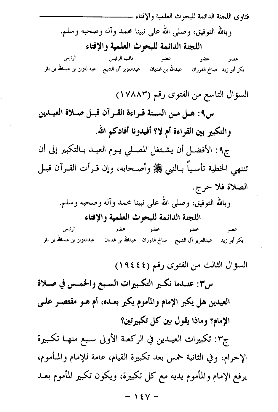 س 9: هل من السنة قراءة القرآن قبل صلاة العيدين والتكبير بين القراءة أم لا؟ أفيدونا أفادكم الله