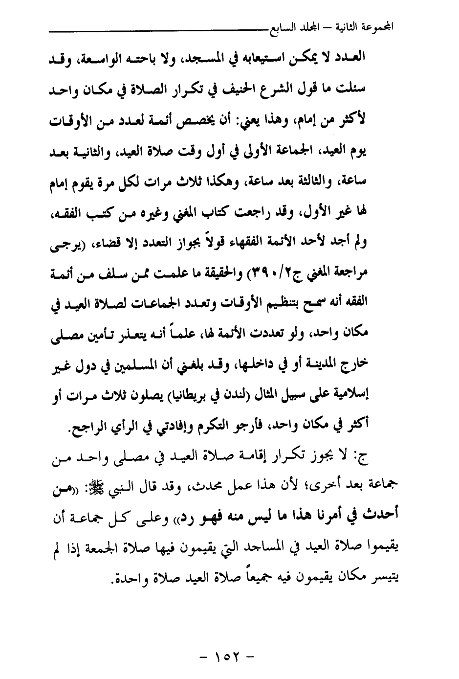 العدد لا يمكن استيعابه في المسجد، ولا باحته الواسعة، وقد سئلت ما قول الشرع الحنيف في تكرار الصلاة في مكان واحد لأكثر من إمام، وهذا يعني: أن يخصص أئمة لعدد من الأوقات يوم العيد، الجماعة الأولى في أول وقت صلاة العيد، والثانية بعد ساعة، والثالثة بعد ساعة، وهكذا ثلاث مرات لكل مرة يقوم إمام لها غير الأول، وقد راجعت كتاب المغني وغيره من كتب الفقه، ولم أجد لأحد الأئمة الفقهاء قولا بجواز التعدد إلا قضاء، (يرجى مراجعة المغني ج 2 390) والحقيقة ما علمت ممن سلف من أئمة الفقه أنه سمح بتنظيم الأوقات وتعدد الجماعات لصلاة العيد في مكان واحد، ولو تعددت الأئمة لها، علما أنه يتعذر تأمين مصلى خارج المدينة أو في داخلها، وقد بلغني أن المسلمين في دول غير إسلامية على سبيل المثال (لندن في بريطانيا) يصلون ثلاث مرات أو أكثر في مكان واحد فأرجو التكرم وإفادتي في الرأي الراجح؟