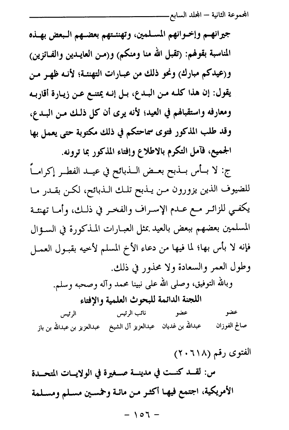 جيرانهم وإخوانهم المسلمين، وتهنئتهم بعضهم البعض بهذه المناسبة بقولهم: (تقبل الله منا ومنكم) و (من العايدين والفائزين) و (عيدكم مبارك) ونحو ذلك من عبارات التهنئة؛ لأنه ظهر من يقول: إن هذا كله من البدع، بل إنه يمتنع عن زيارة أقاربه ومعارفه واستقبالهم في العيد؛ لأنه يرى أن كل ذلك من البدع، وقد طلب المذكور فتوى سماحتكم في ذلك مكتوبة حتى يعمل بها الجميع، فآمل التكرم بالاطلاع وإفتاء المذكور بما ترونه