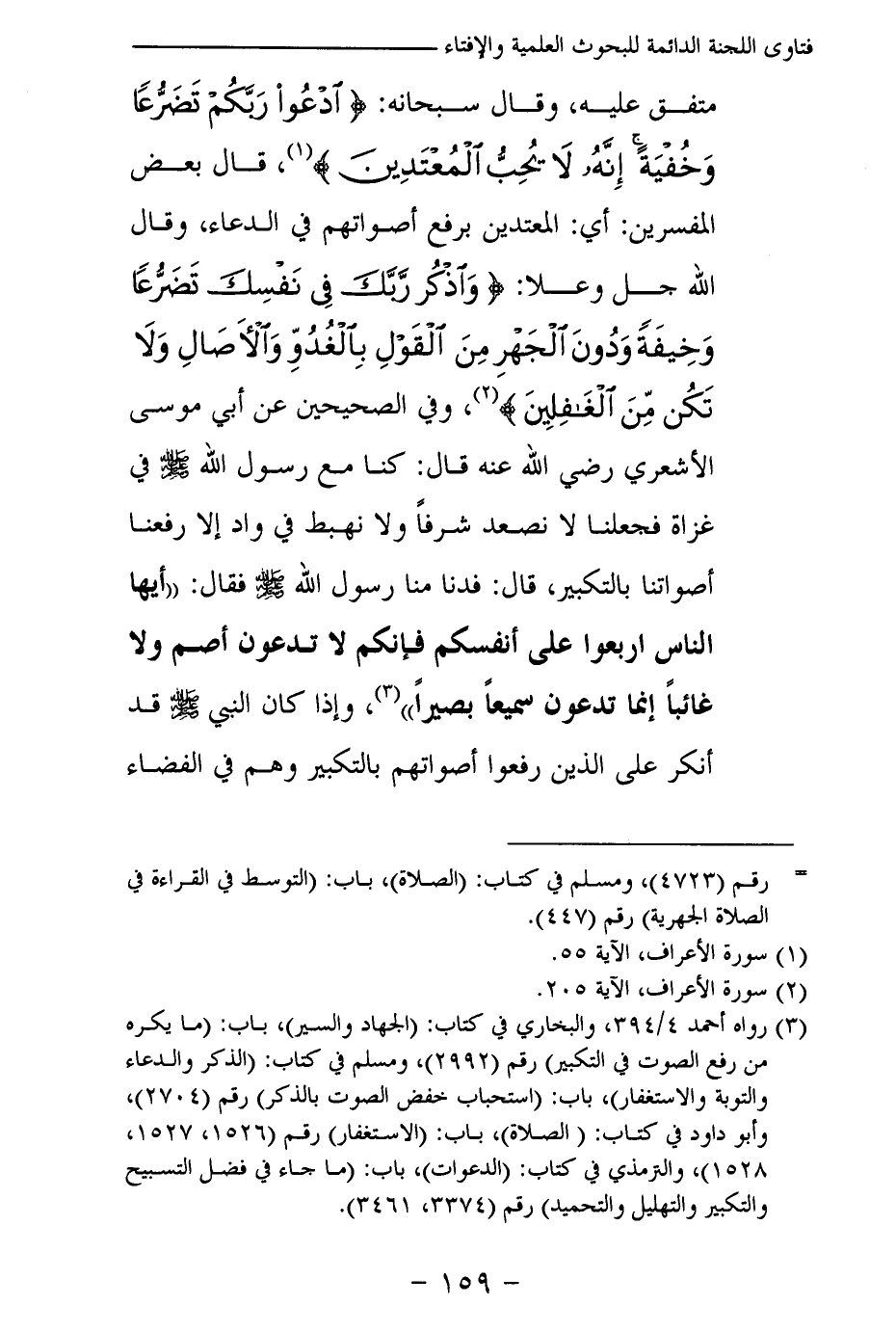 متفق عليه، وقال سبحانه: {ادْعُوا رَبَّكُمْ تَضَرُّعًا وَخُفْيَةً إِنَّهُ لَا يُحِبُّ الْمُعْتَدِينَ} (¬1) ، قال بعض المفسرين: أي: المعتدين برفع أصواتهم في الدعاء، وقال جل وعلا: {وَاذْكُرْ رَبَّكَ فِي نَفْسِكَ تَضَرُّعًا وَخِيفَةً وَدُونَ الْجَهْرِ مِنَ الْقَوْلِ بِالْغُدُوِّ وَالْآصَالِ وَلَا تَكُنْ مِنَ الْغَافِلِينَ} (¬2) ، وفي الصحيحين عن أبي موسى الأشعري رضي الله عنه قال: «كنا مع رسول الله - صلى الله عليه وسلم - في غزاة فجعلنا لا نصعد شرفا ولا نهبط في واد إلا رفعنا أصواتنا بالتكبير، قال: فدنا منا رسول الله - صلى الله عليه وسلم - فقال: أيها الناس اربعوا على أنفسكم فإنكم لا تدعون أصم ولا غائبا إنما تدعون سميعا بصيرا (¬3) » وإذا كان النبي - صلى الله عليه وسلم - قد أنكر على الذين رفعوا أصواتهم بالتكبير وهم في الفضاء