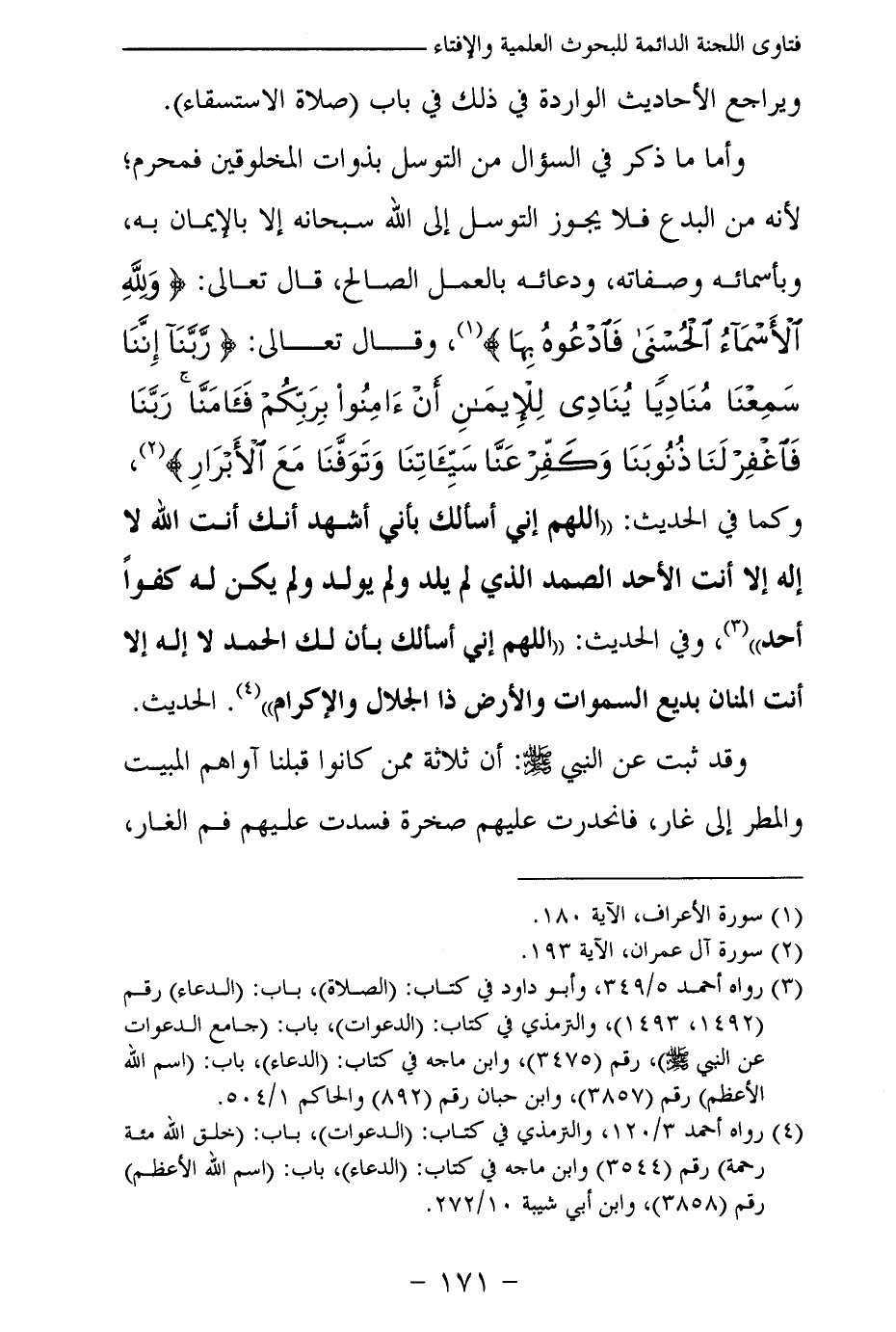 وأما ما ذكر في السؤال من التوسل بذوات المخلوقين فمحرم؛ لأنه من البدع فلا يجوز التوسل إلى الله سبحانه إلا بالإيمان به، وبأسمائه وصفاته، ودعائه بالعمل الصالح، قال تعالى: {وَلِلَّهِ الْأَسْمَاءُ الْحُسْنَى فَادْعُوهُ بِهَا} (¬1) ، وقال تعالى: {رَبَّنَا إِنَّنَا سَمِعْنَا مُنَادِيًا يُنَادِي لِلْإِيمَانِ أَنْ آمِنُوا بِرَبِّكُمْ فَآمَنَّا رَبَّنَا فَاغْفِرْ لَنَا ذُنُوبَنَا وَكَفِّرْ عَنَّا سَيِّئَاتِنَا وَتَوَفَّنَا مَعَ الْأَبْرَارِ} (¬2) ، وكما في الحديث: «اللهم إني أسألك بأني أشهد أنك أنت الله لا إله إلا أنت الأحد الصمد الذي لم يلد ولم يولد ولم يكن له كفوا أحد (¬3) » وفي الحديث: «اللهم إني أسألك بأن لك الحمد لا إله إلا أنت المنان بديع السماوات والأرض ذا الجلال والإكرام (¬4) » الحديث.