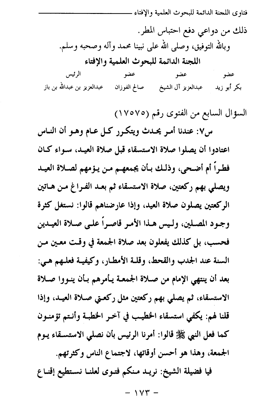 س 7: عندنا أمر يحدث ويتكرر كل عام وهو أن الناس اعتادوا أن يصلوا صلاة الاستسقاء قبل صلاة العيد، سواء كان فطرا أم أضحى، وذلك بأن يجمعهم من يؤمهم لصلاة العيد ويصلي بهم ركعتين، صلاة الاستسقاء ثم بعد الفراغ من هاتين الركعتين يصلون صلاة العيد، وإذا عارضناهم قالوا: نستغل كثرة وجود المصلين، وليس هذا الأمر قاصرا على صلاة العيدين فحسب، بل كذلك يفعلون بعد صلاة الجمعة في وقت معين من السنة عند الجدب والقحط، وقلة الأمطار، وكيفية فعلهم هي: بعد أن ينتهي الإمام من صلاة الجمعة يأمرهم بأن ينووا صلاة الاستسقاء، ثم يصلي بهم ركعتين مثل ركعتي صلاة العيد، وإذا قلنا لهم: يكفي استسقاء الخطيب في آخر الخطبة وأنتم تؤمنون كما فعل النبي - صلى الله عليه وسلم - قالوا: أمرنا الرئيس بأن نصلي الاستسقاء يوم الجمعة، وهذا هو أحسن أوقاتها، لاجتماع الناس وكثرتهم.