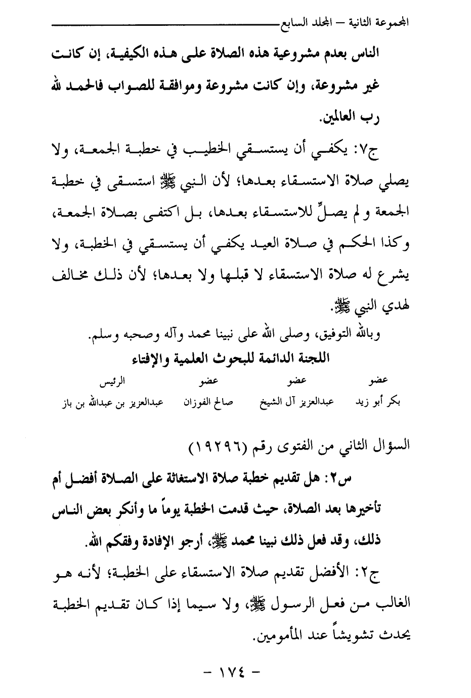 ج 7: يكفي أن يستسقي الخطيب في خطبة الجمعة، ولا يصلي صلاة الاستسقاء بعدها؛ لأن النبي - صلى الله عليه وسلم - استسقى في خطبة الجمعة ولم يصل للاستسقاء بعدها، بل اكتفى بصلاة الجمعة، وكذا الحكم في صلاة العيد يكفي أن يستسقي في الخطبة، ولا يشرع له صلاة الاستسقاء لا قبلها ولا بعدها؛ لأن ذلك مخالف لهدي النبي - صلى الله عليه وسلم -.