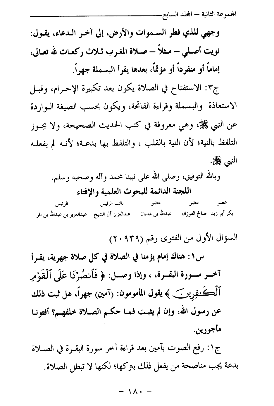 س 1: هناك إمام يؤمنا في الصلاة في كل صلاة جهرية، يقرأ آخر سورة البقرة، وإذا وصل: {فَانْصُرْنَا عَلَى الْقَوْمِ الْكَافِرِينَ} (¬1) يقول المأمومون: (آمين) جهرا، هل ثبت ذلك عن رسول الله، وإن لم يثبت فما حكم الصلاة خلفهم؟ أفتونا مأجورين