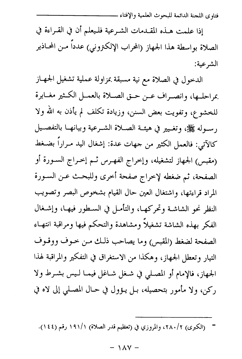 الدخول في الصلاة مع نية مسبقة بمزاولة عملية تشغيل الجهاز بمراحلها، وانصراف عن حق الصلاة بالعمل الكثير مغايرة للخشوع، وتفويت بعض السنن، وزيادة تكلف لم يأذن به الله ولا رسوله - صلى الله عليه وسلم -، وتغيير في هيئة الصلاة الشرعية وبيانها بالتفصيل كالآتي: فالعمل الكثير من جهات عدة: إشغال اليد مرارا بضغط (مقبس) الجهاز لتشغيله، وإخراج الفهرس ثم إخراج السورة أو الصفحة، ثم ضغطه لإخراج صفحة أخرى وللبحث عن السورة المراد قراءتها، واشتغال العين حال القيام بشخوص البصر وتصويب النظر نحو الشاشة وتحركها، والتأمل في السطور فيها، وإشغال الفكر بهذه الشاشة تشغيلا ومشاهدة والتحكم فيها ومراقبة انتهاء الصفحة لضغط (المقبس) وما يصاحب ذلك من خوف ووقوف التيار وتعطل الجهاز، وهكذا من الاستغراق في التفكير والمراقبة لهذا الجهاز، فالإمام أو المصلي في شغل شاغل فيما ليس بشرط ولا ركن، ولا مأمور بتحصيله، بل يؤول في حال المصلي إلى لاه في