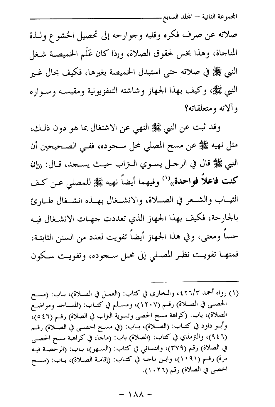 وقد ثبت عن النبي - صلى الله عليه وسلم - النهي عن الاشتغال بما هو دون ذلك، مثل نهيه عن مسح المصلي لمحل سجوده، ففي الصحيحين أن النبي - صلى الله عليه وسلم - قال: «في الرجل يسوي التراب حيث يسجد، قال: إن كنت فاعلا فواحدة (¬1) » وفيهما أيضا نهيه - صلى الله عليه وسلم - للمصلي عن كف الثياب والشعر في الصلاة، والانشغال بهذه انشغال طارئ بالجارحة، فكيف بهذا الجهاز الذي تعددت جهات الانشغال فيه حسا ومعنى، وفي هذا الجهاز أيضا تفويت لعدد من السنن الثابتة، فمنها تفويت نظر المصلي إلى محل سجوده، وتفويت سكون